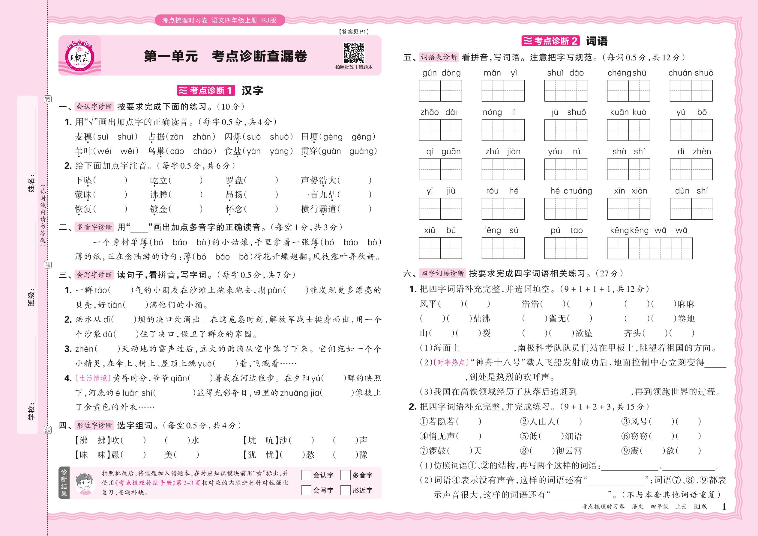2024秋上册四年级语文人教版 第一单元 考点诊断查漏卷