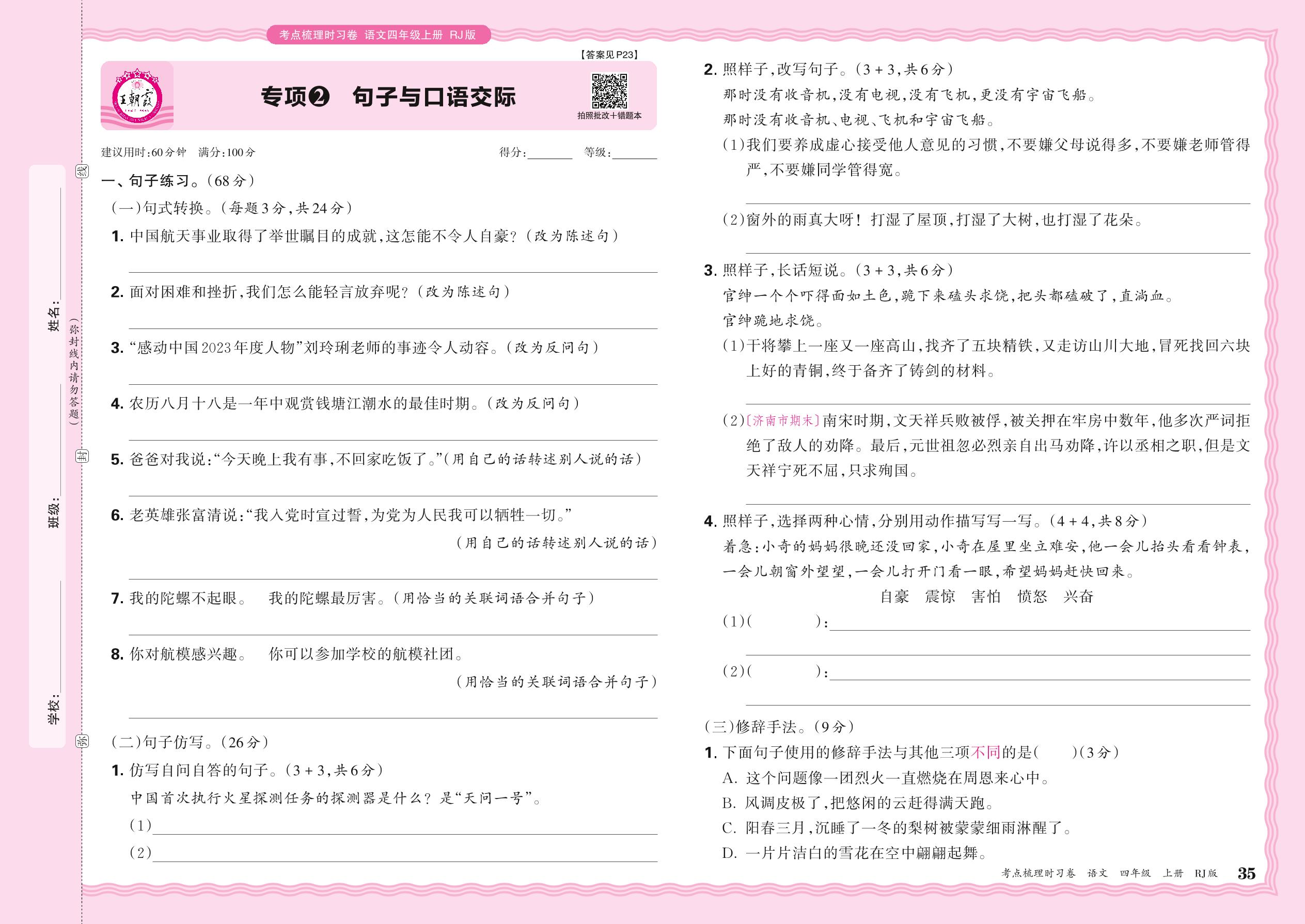 2024秋上册四年级语文人教版 期末专项卷KD版·句子与口语交际【2】