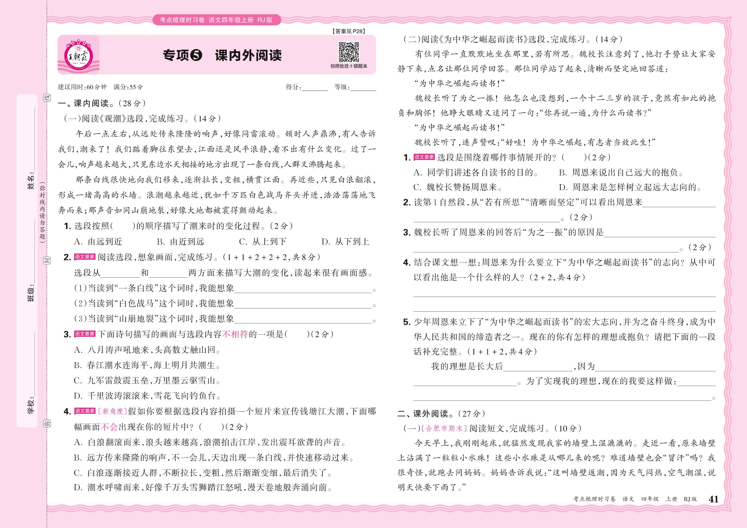 2024秋上册四年级语文人教版 期末专项卷KD版·课内外阅读【5】