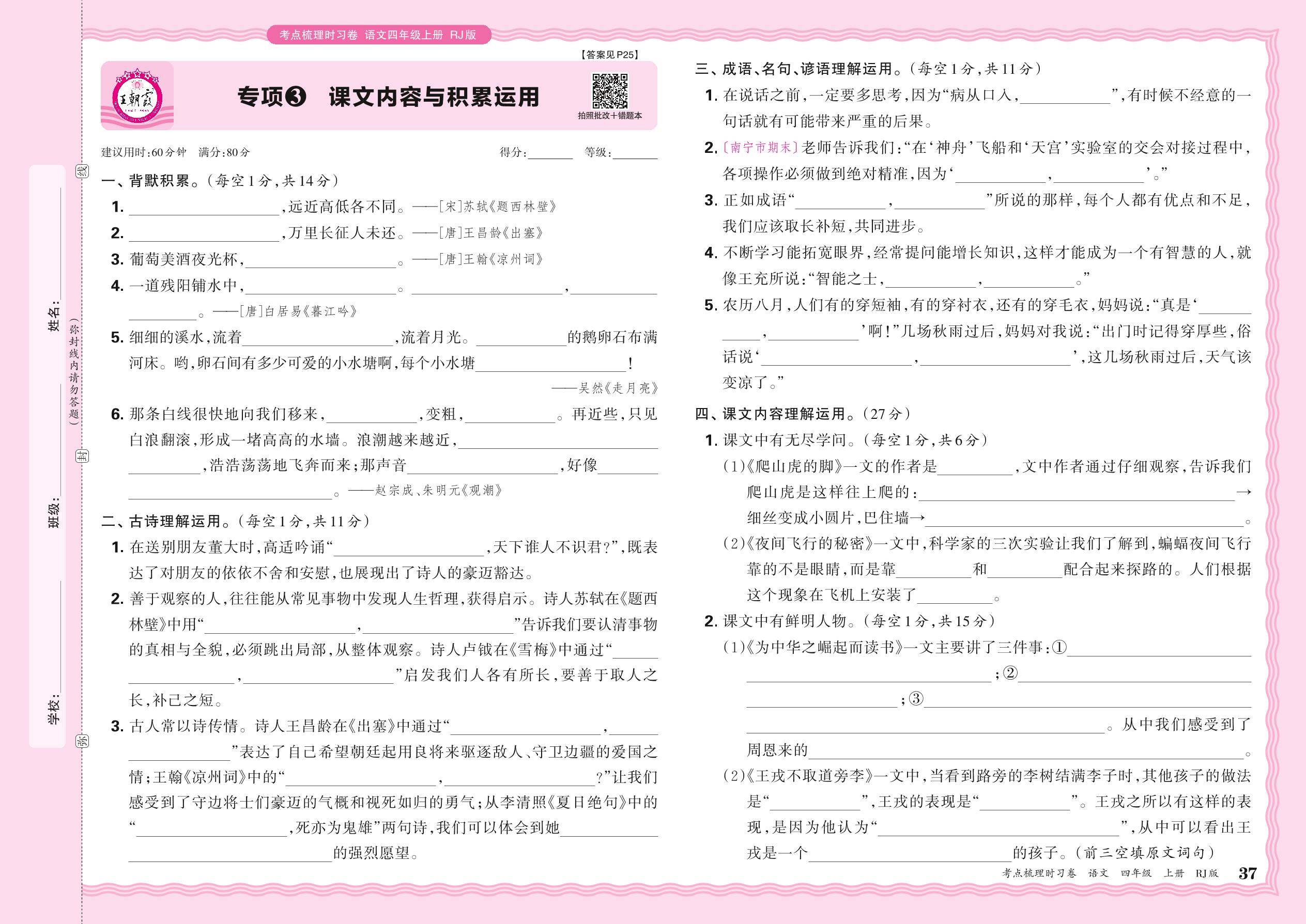 2024秋上册四年级语文人教版 期末专项卷KD版·课文内容与积累运用【3】