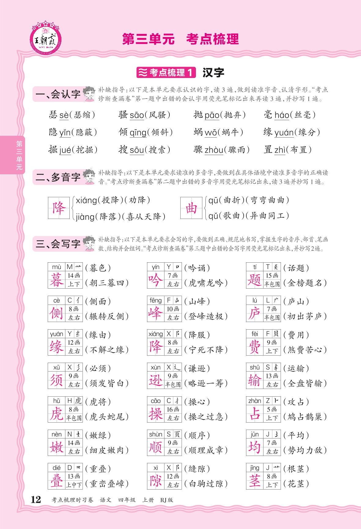 2024秋上册四年级语文人教版 考点梳理补缺手册——第三单元