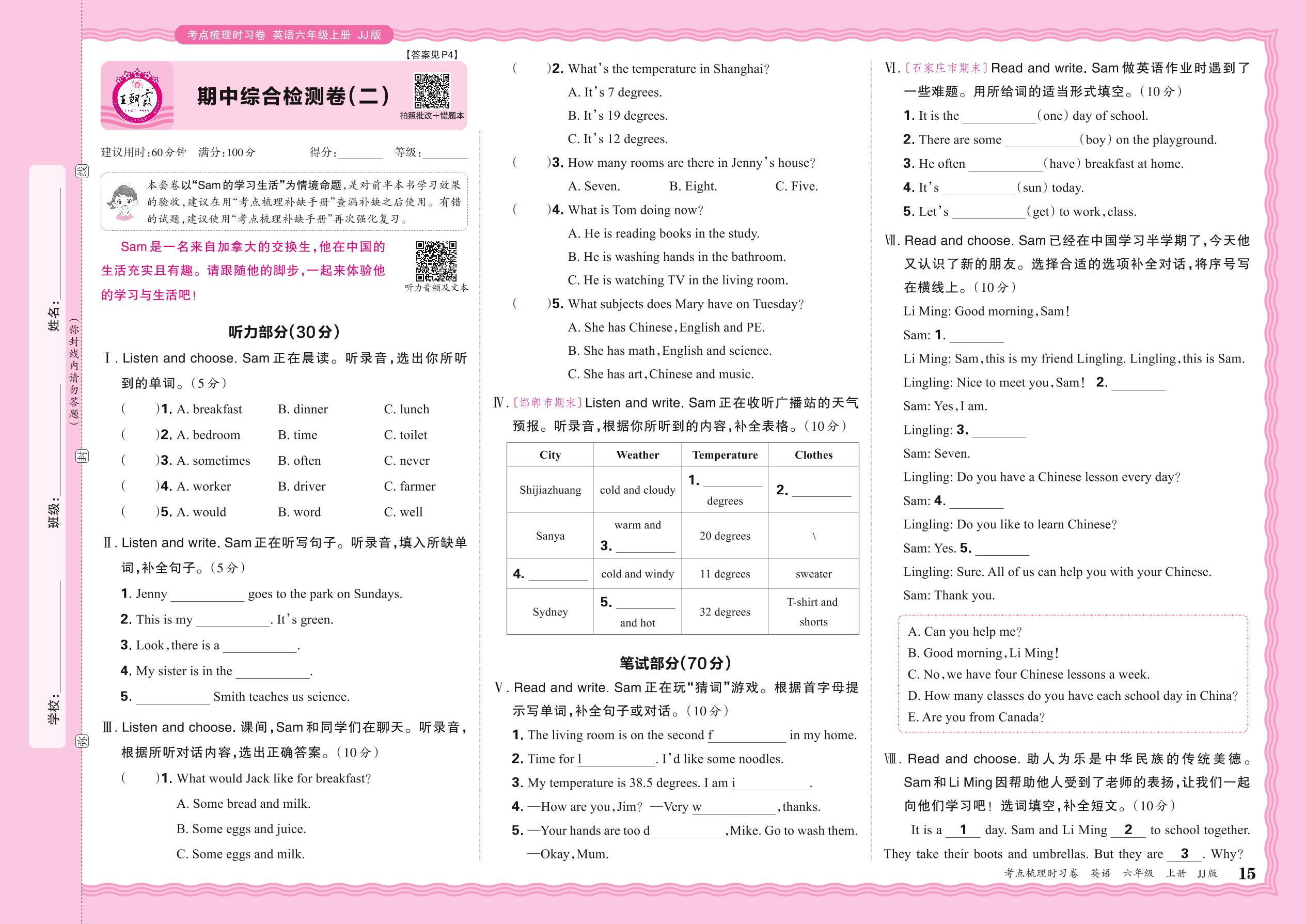 2024秋上册六年级英语冀教版 期中综合检测卷(二)