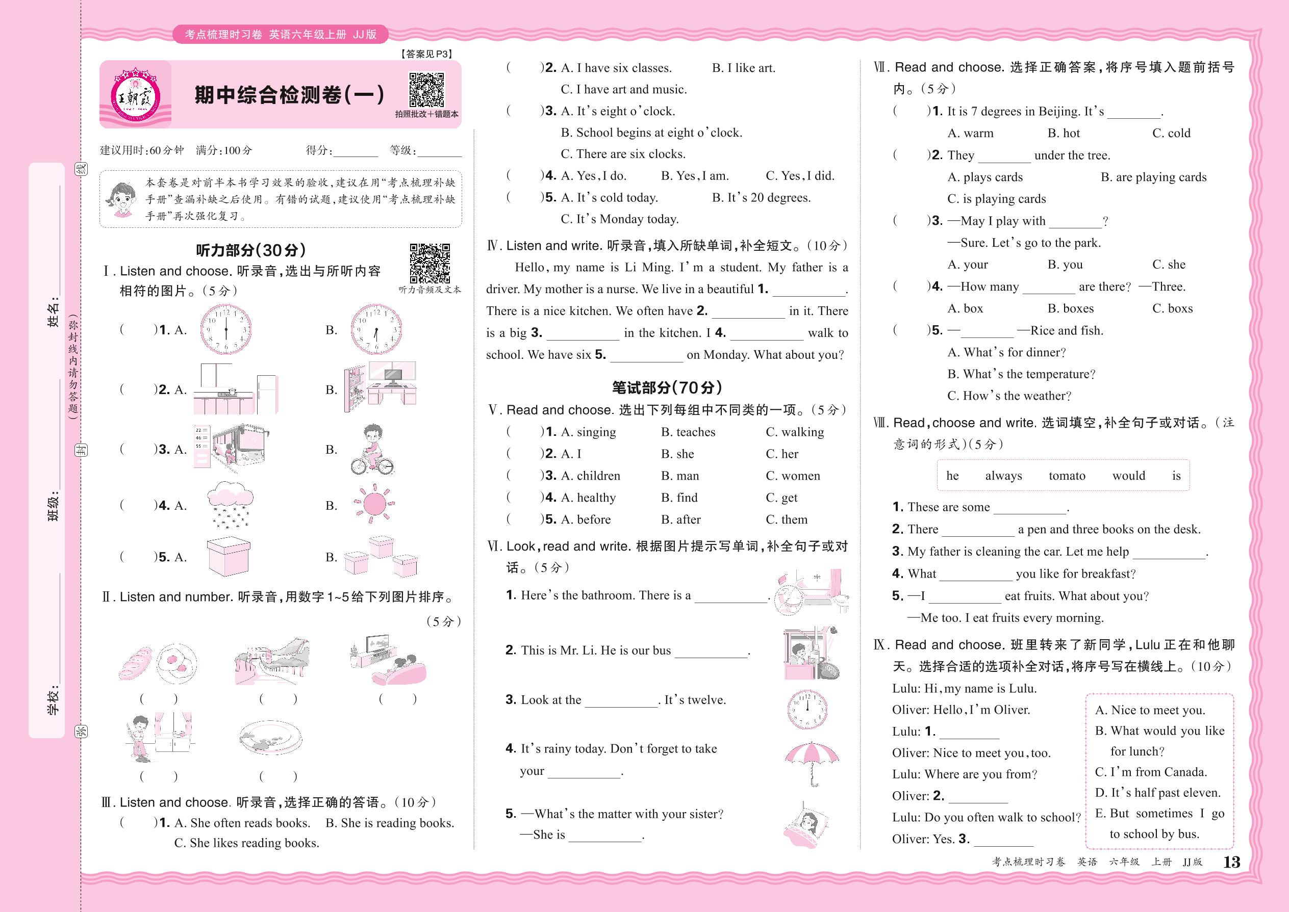 2024秋上册六年级英语冀教版 期中综合检测卷(一)