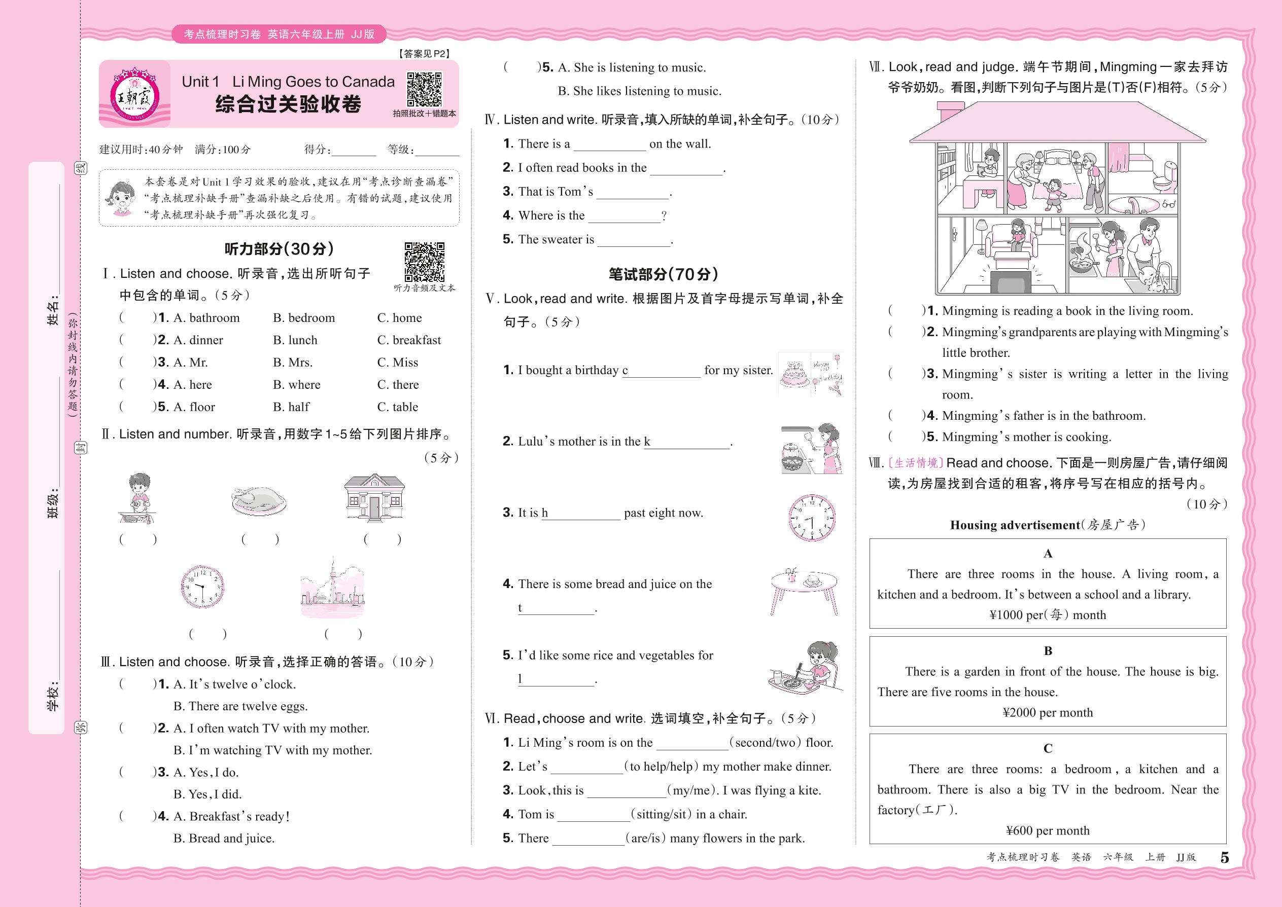 六年级英语冀教版上册单元卷