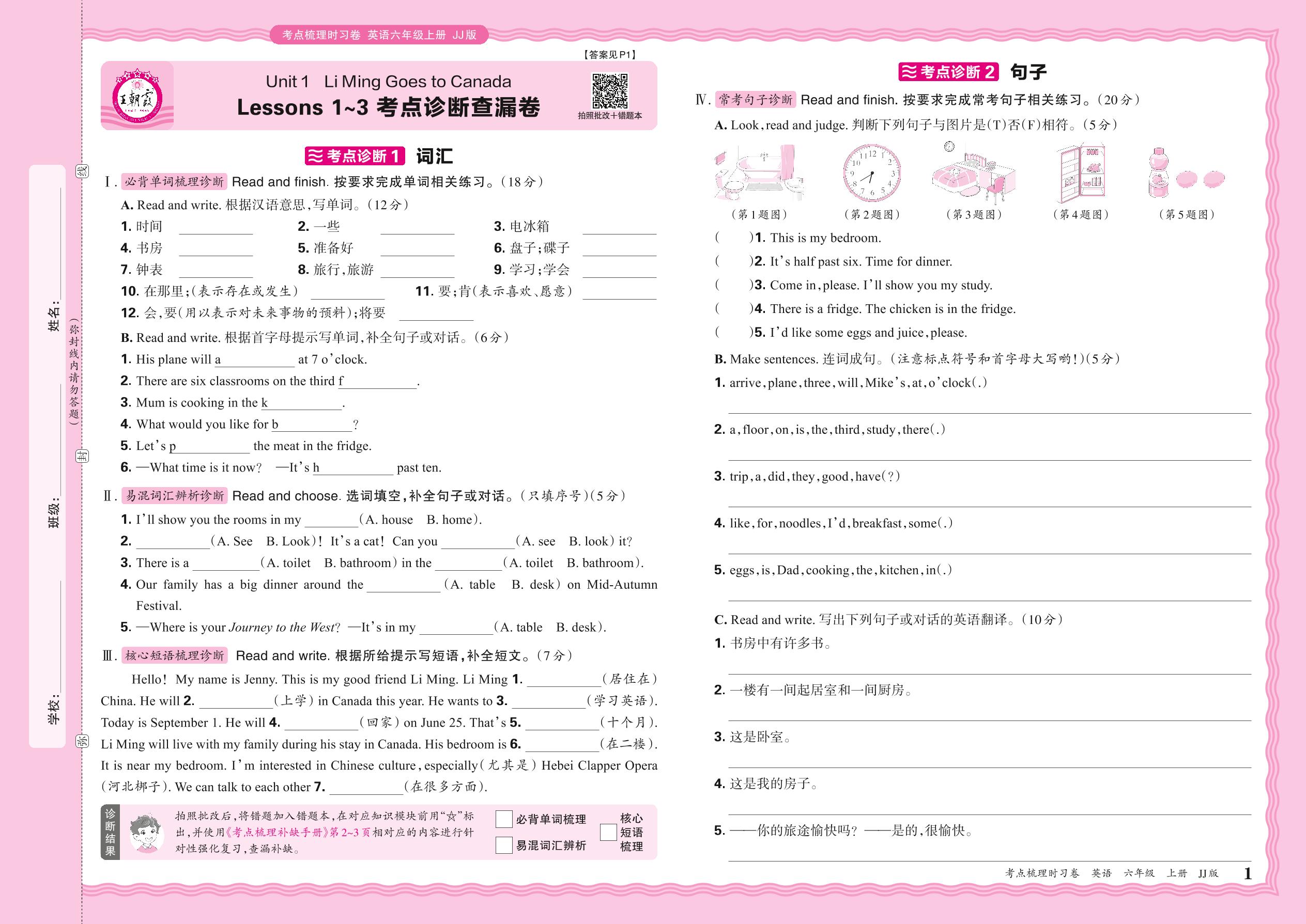 2024秋上册六年级英语冀教版 Unit 1 Lessons 1~3 考点诊断查漏卷