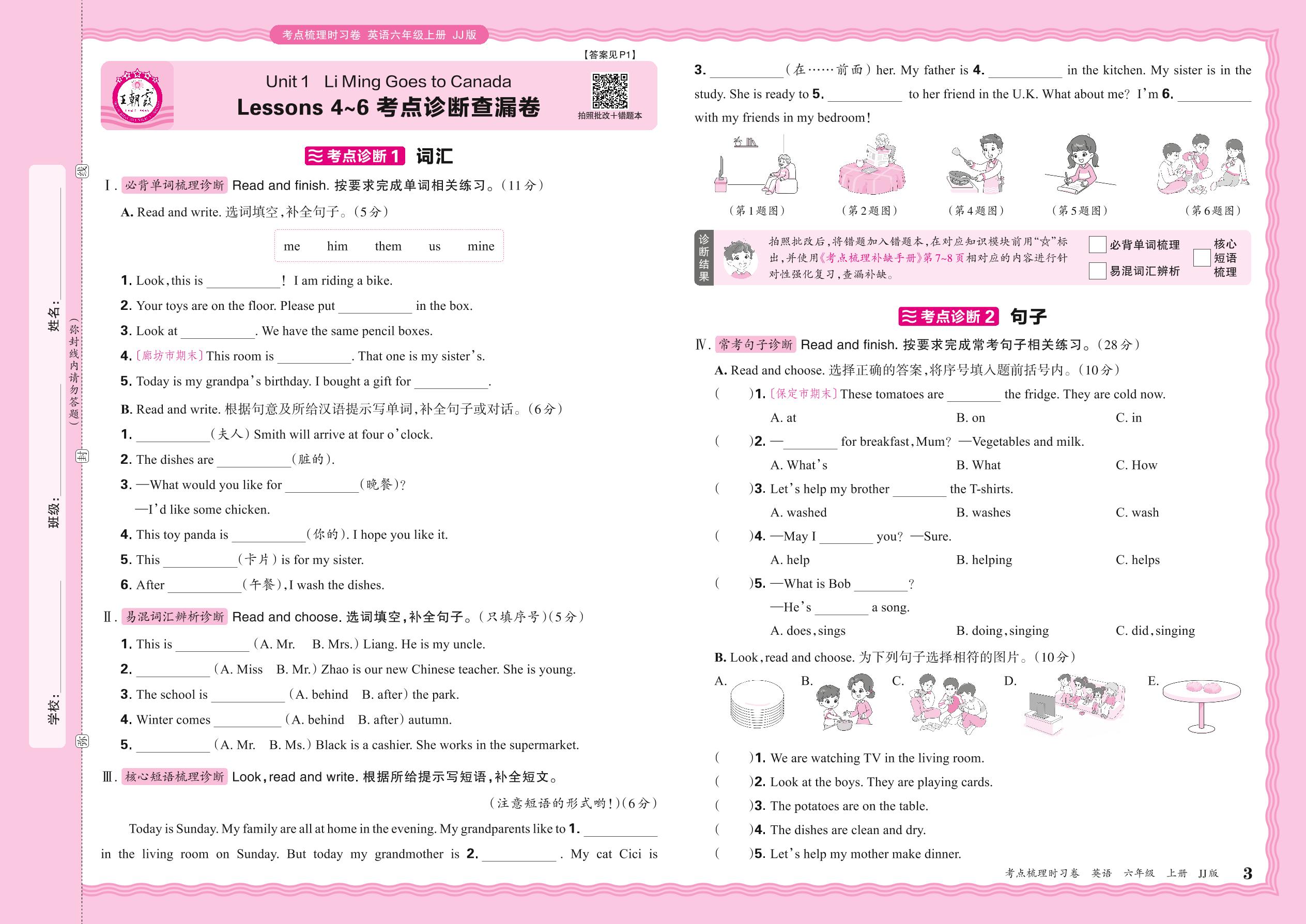2024秋上册六年级英语冀教版 Unit 1 Lessons 4~6 考点诊断查漏卷