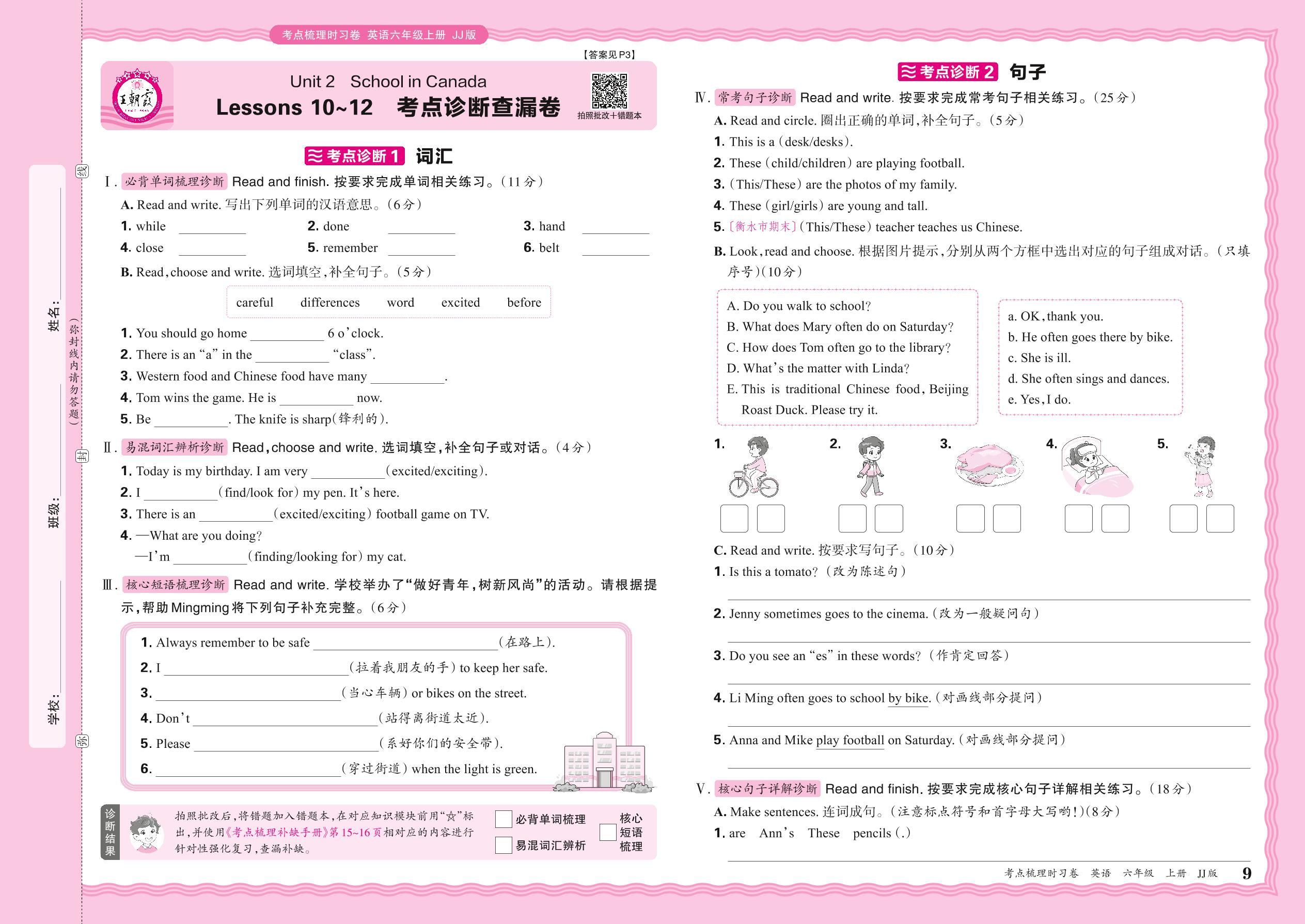 2024秋上册六年级英语冀教版 Unit 2 Lessons 10~12 考点诊断查漏卷