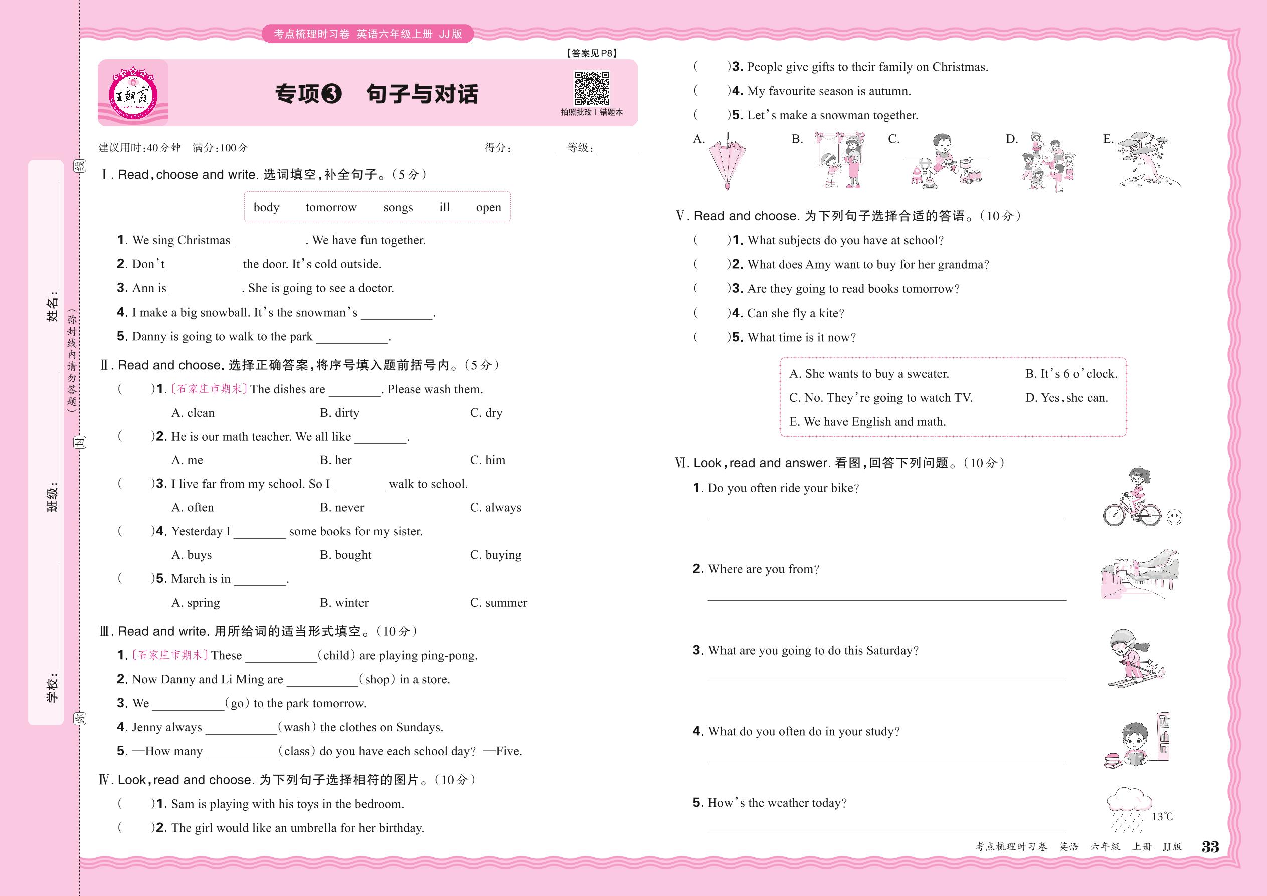 六年级英语冀教版上册专项卷