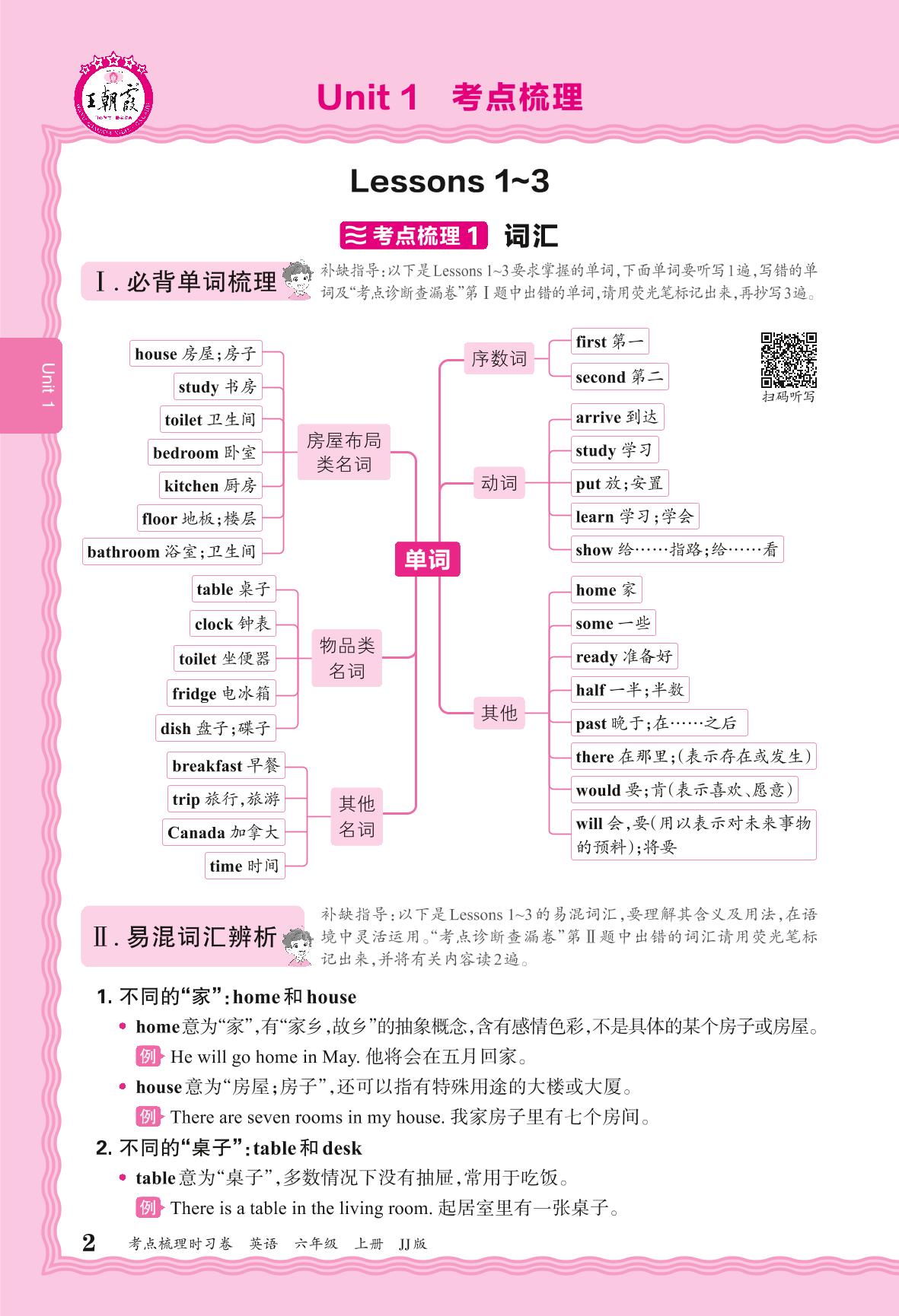 2024秋上册六年级英语冀教版 考点梳理补缺手册——Unit 1 Lessons 1~3