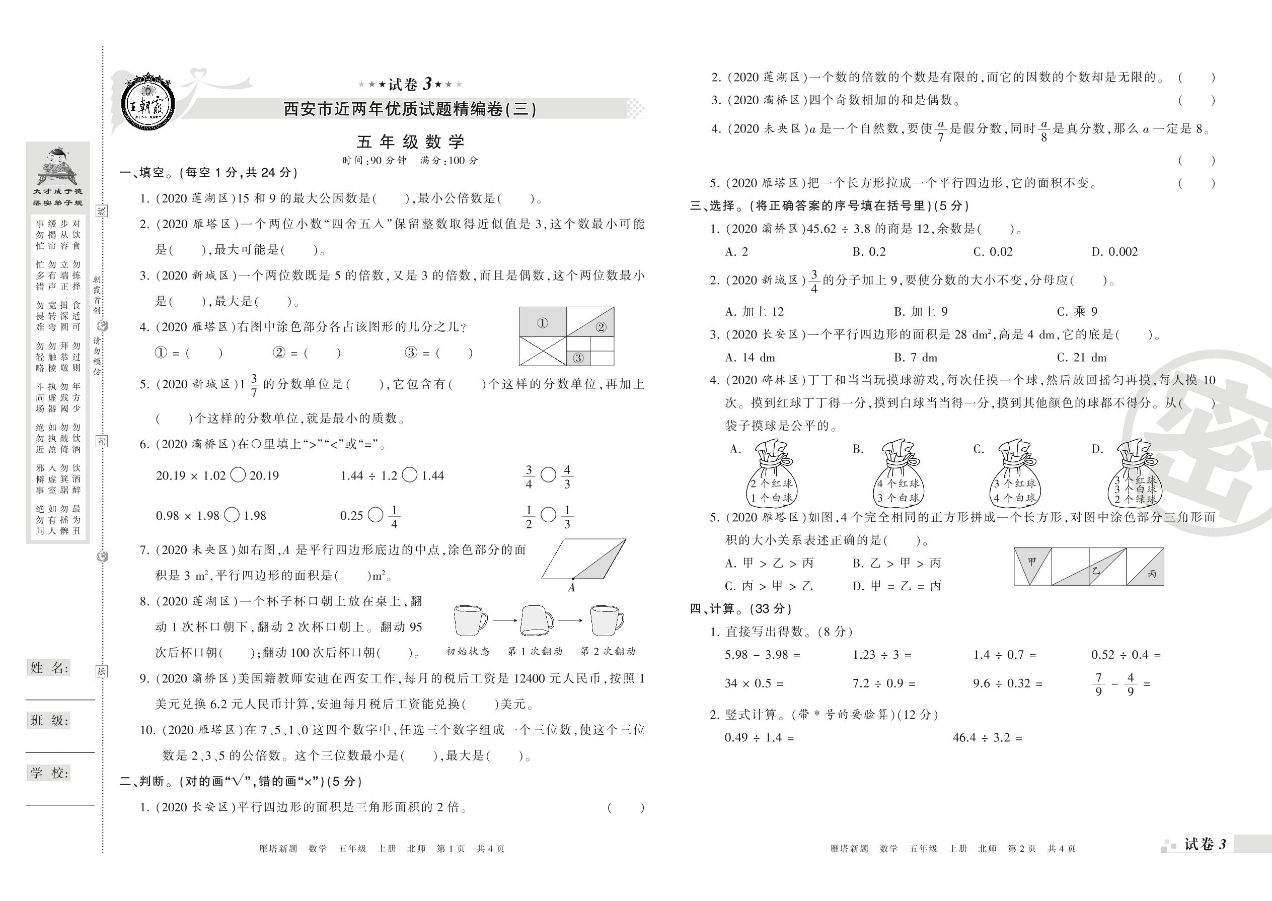 西安市近两年优质试题精编卷(三)五年级上册数学(北师版)【3】
