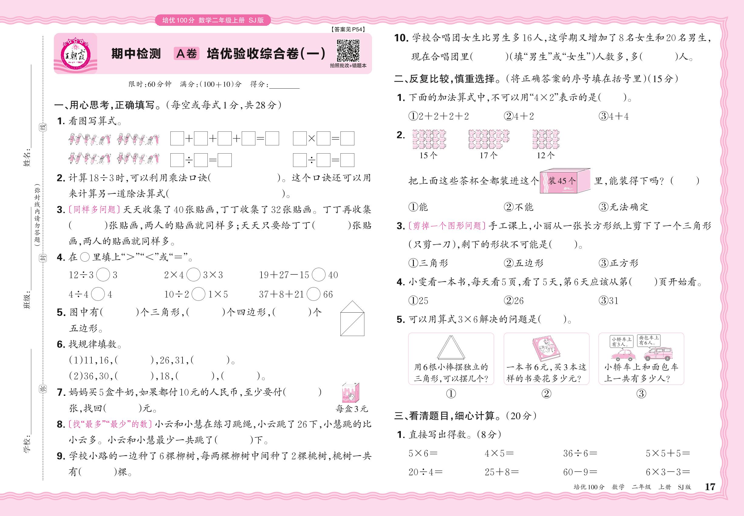 二年级数学苏教版上册期中卷