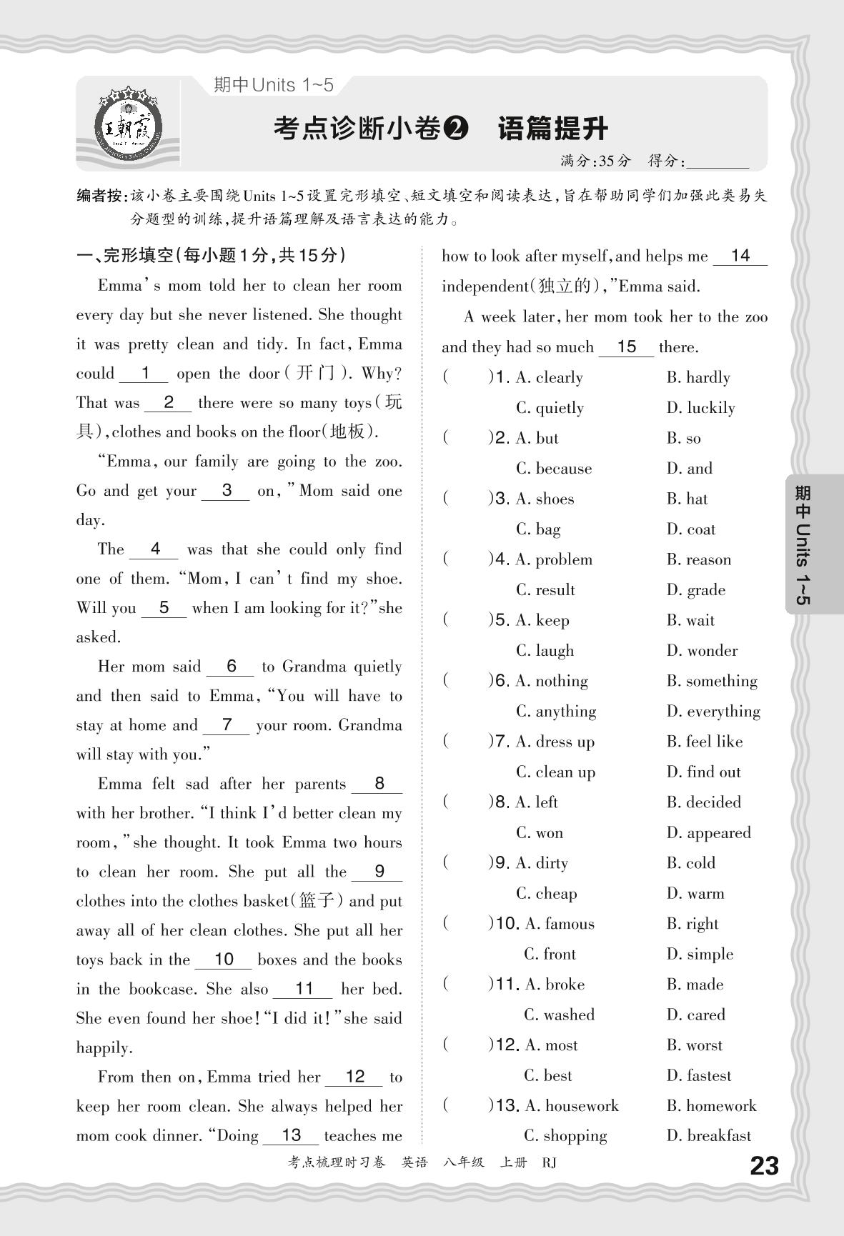 2024秋上册八年级英语人教版 期中Unit 1~5 考点诊断小卷2 语篇提升