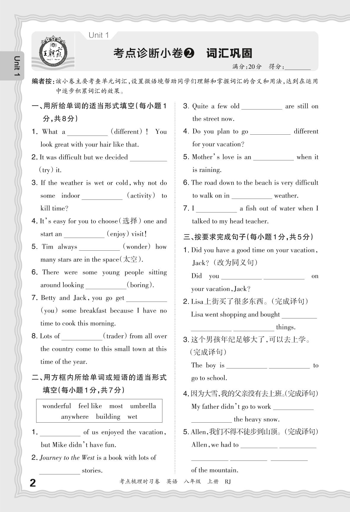 2024秋上册八年级英语人教版 Unit 1 考点诊断小卷2 词汇巩固_R240827102308141