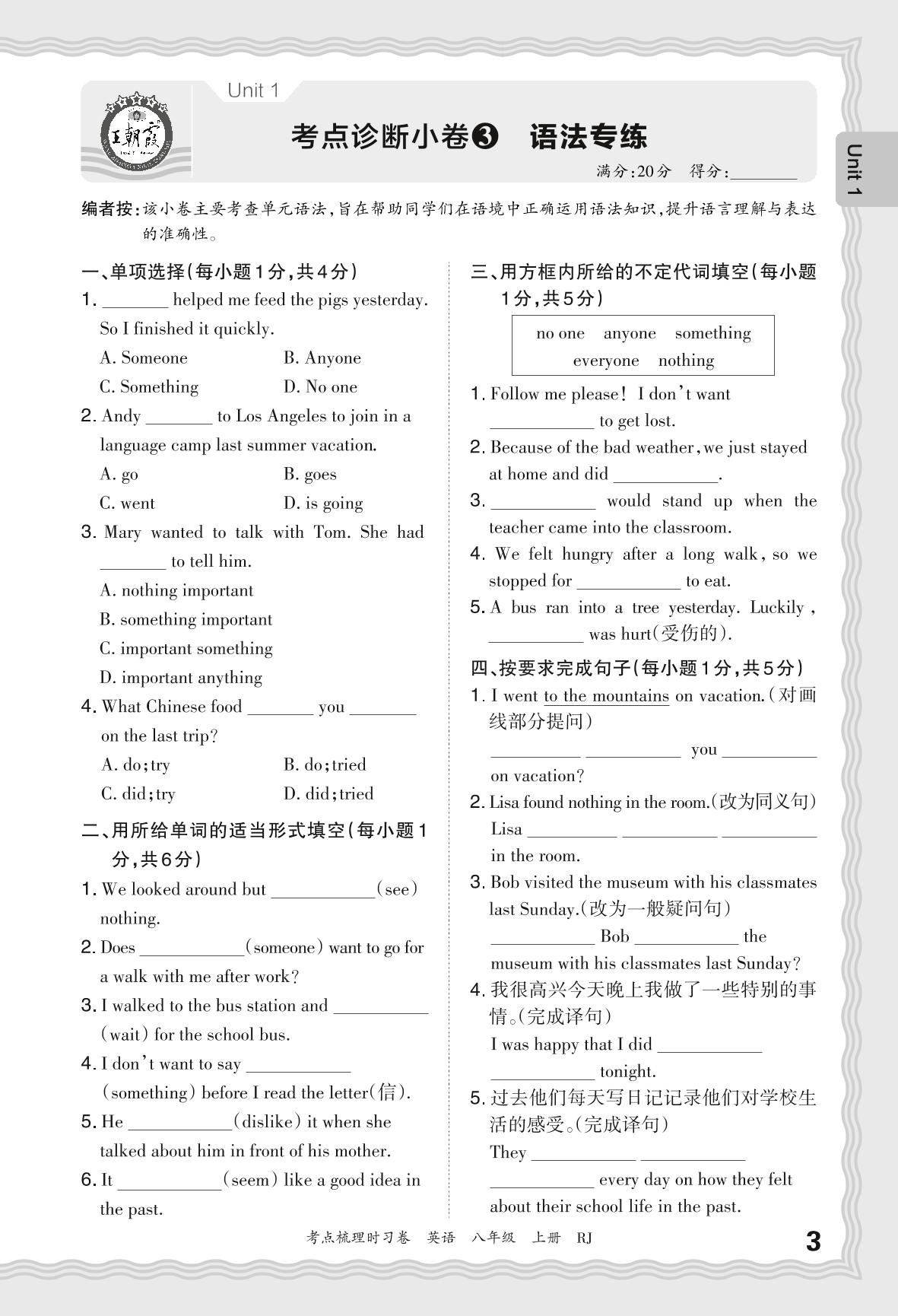 2024秋上册八年级英语人教版 Unit 1 考点诊断小卷3 语法专练_R240827102310320