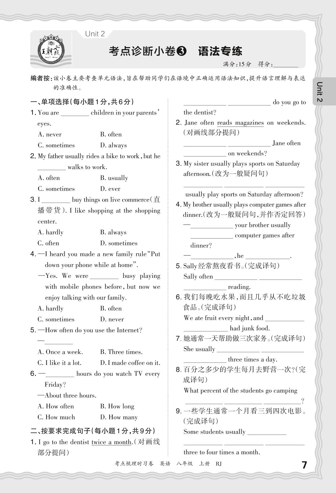 2024秋上册八年级英语人教版 Unit 2 考点诊断小卷3 语法专练_R240827102311689