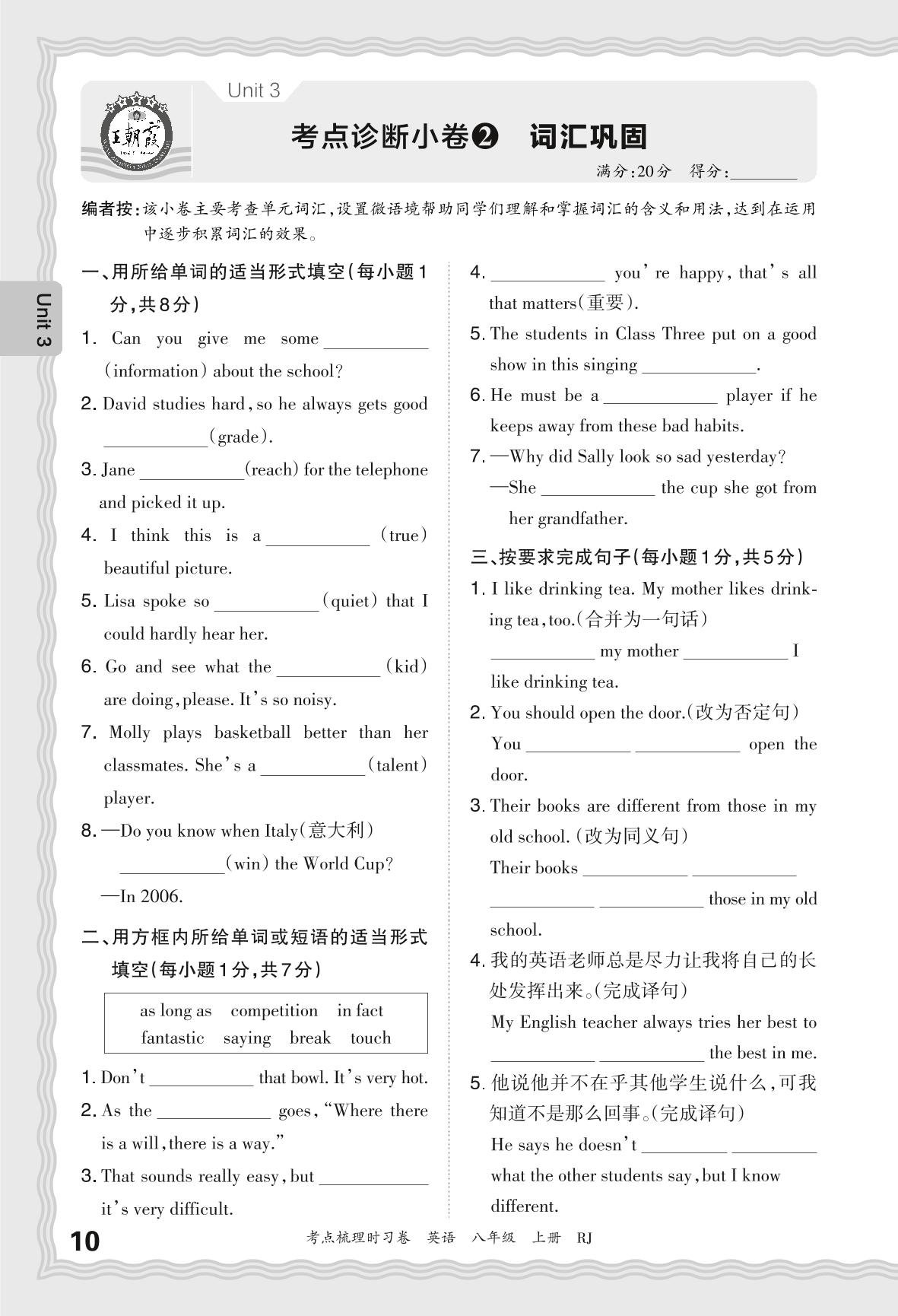 2024秋上册八年级英语人教版 Unit 3 考点诊断小卷2 词汇巩固_R240827102312386