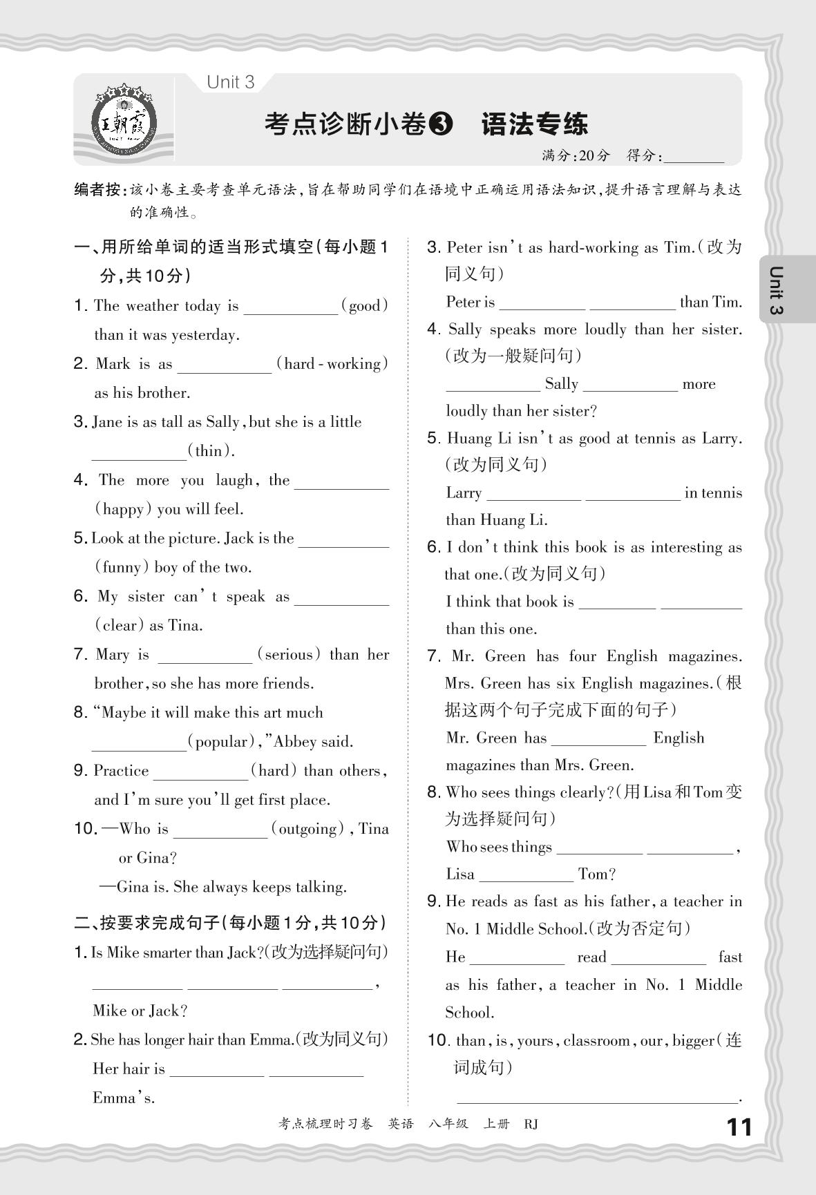 2024秋上册八年级英语人教版 Unit 3 考点诊断小卷3 语法专练_R240827102314029