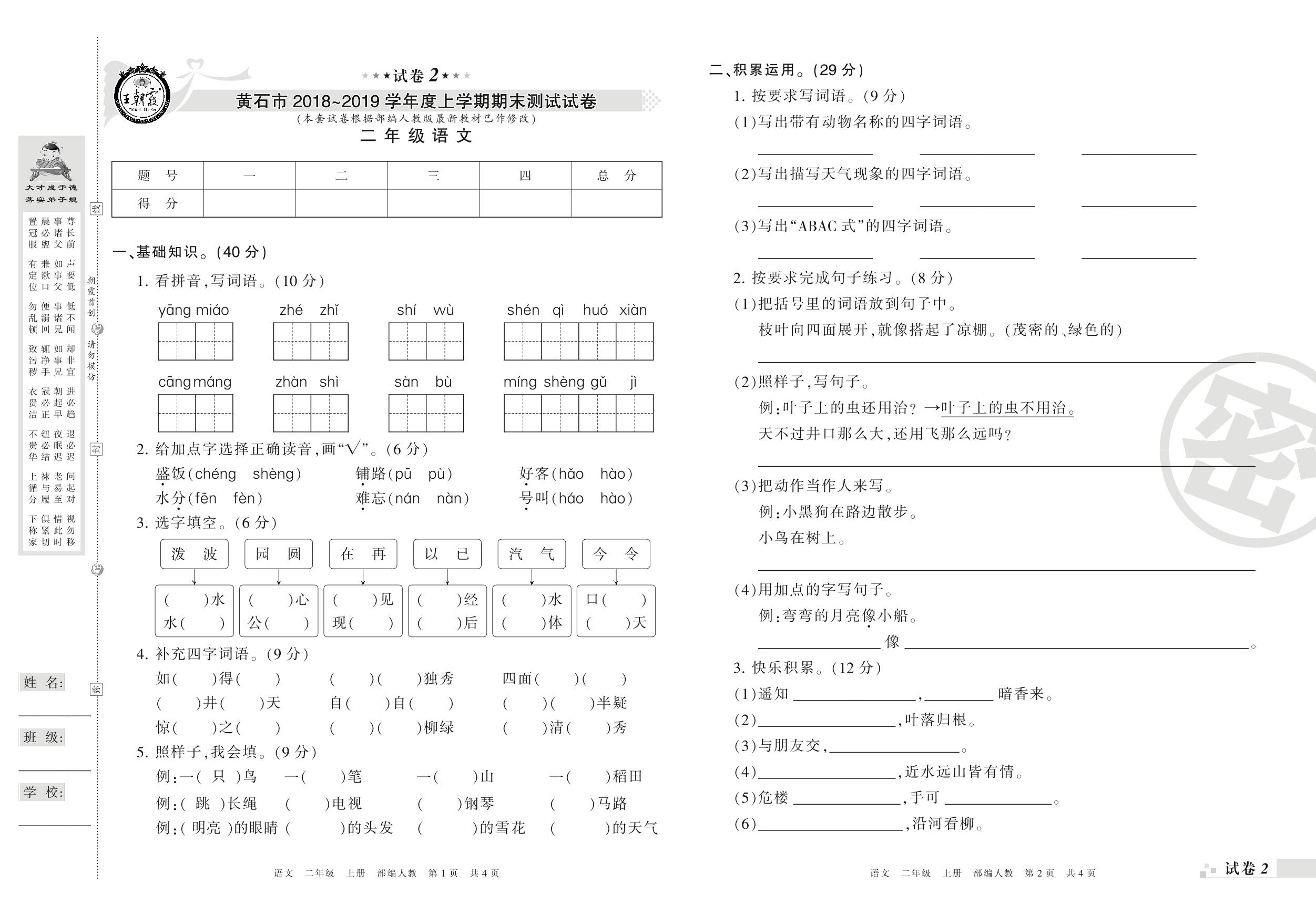 2018-2019学年第一学期黄石市二年级语文试卷(人教版)【2】