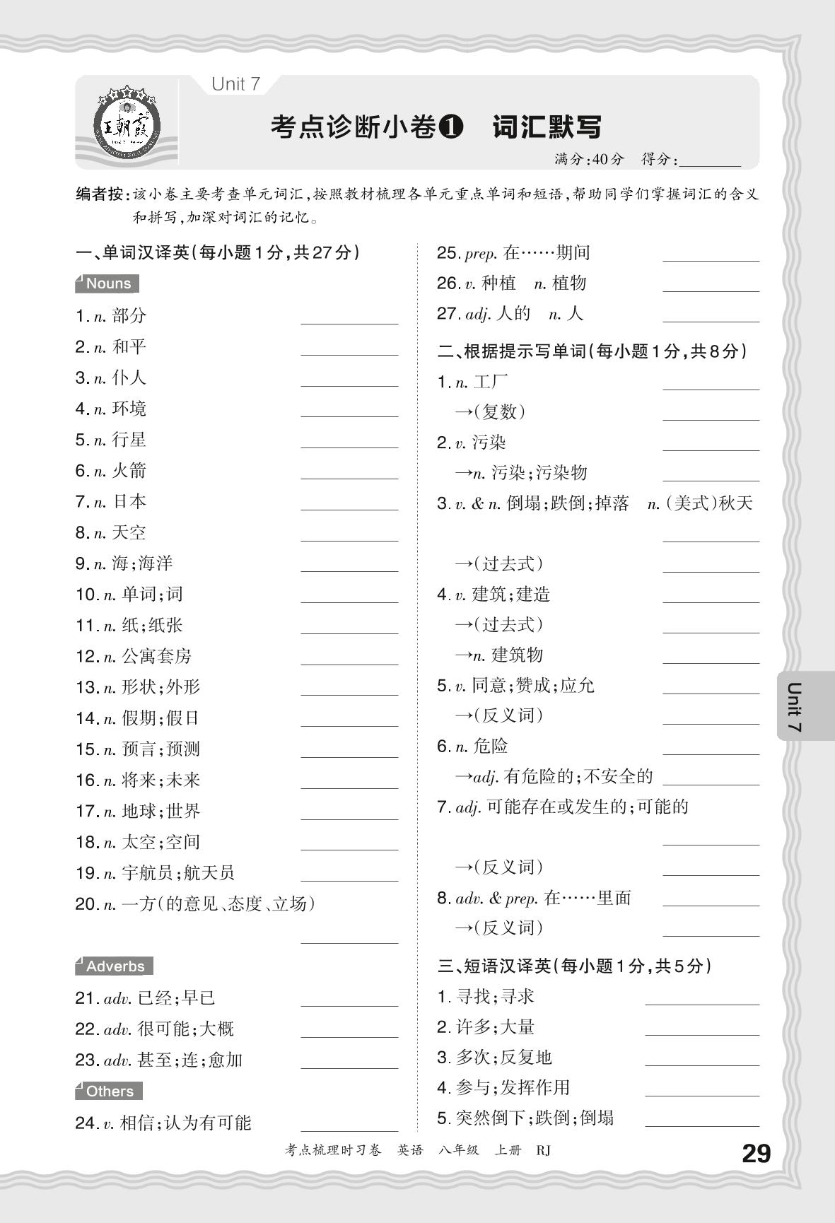 2024秋上册八年级英语人教版 Unit 7 考点诊断小卷1 词汇默写_R240827102320967