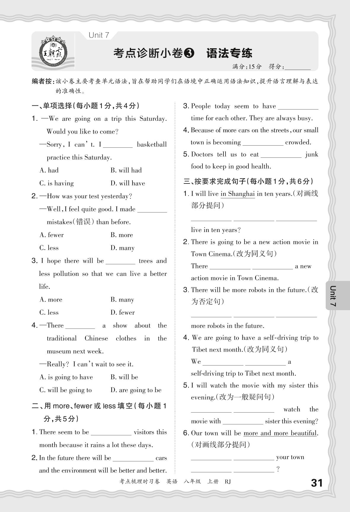 2024秋上册八年级英语人教版 Unit 7 考点诊断小卷3 语法专练_R240827102321035