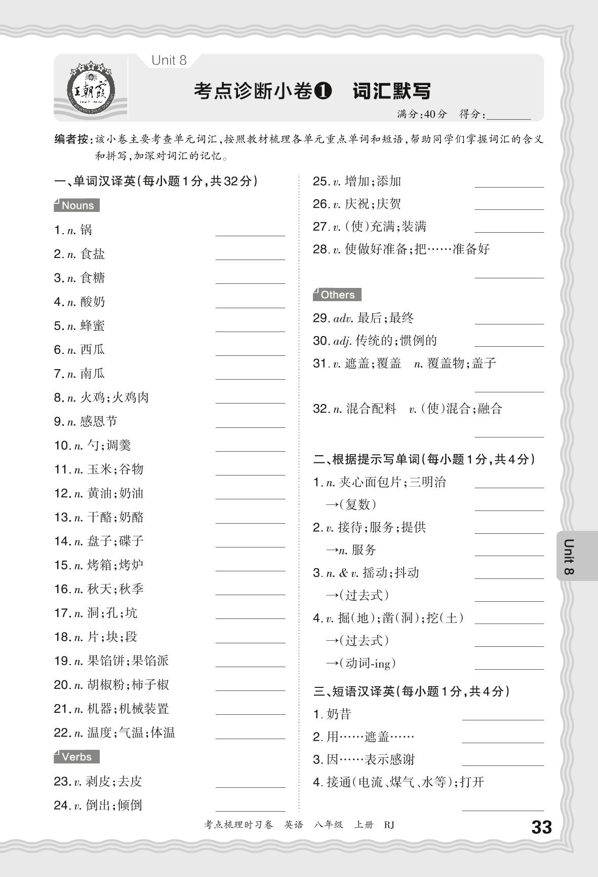 2024秋上册八年级英语人教版 Unit 8 考点诊断小卷1 词汇默写_R240827102323699