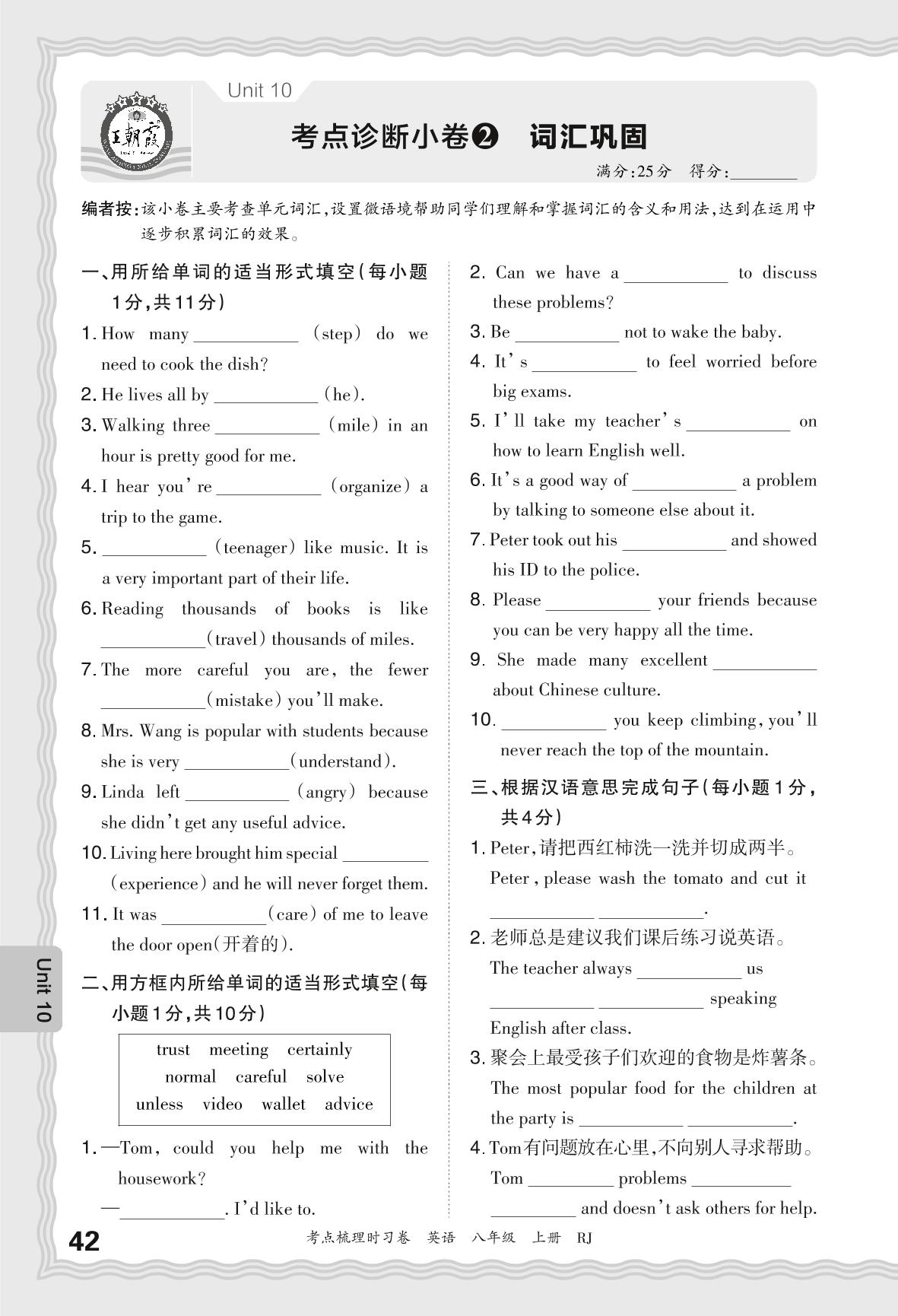2024秋上册八年级英语人教版 Unit 10 考点诊断小卷2 词汇巩固_R240827102326829