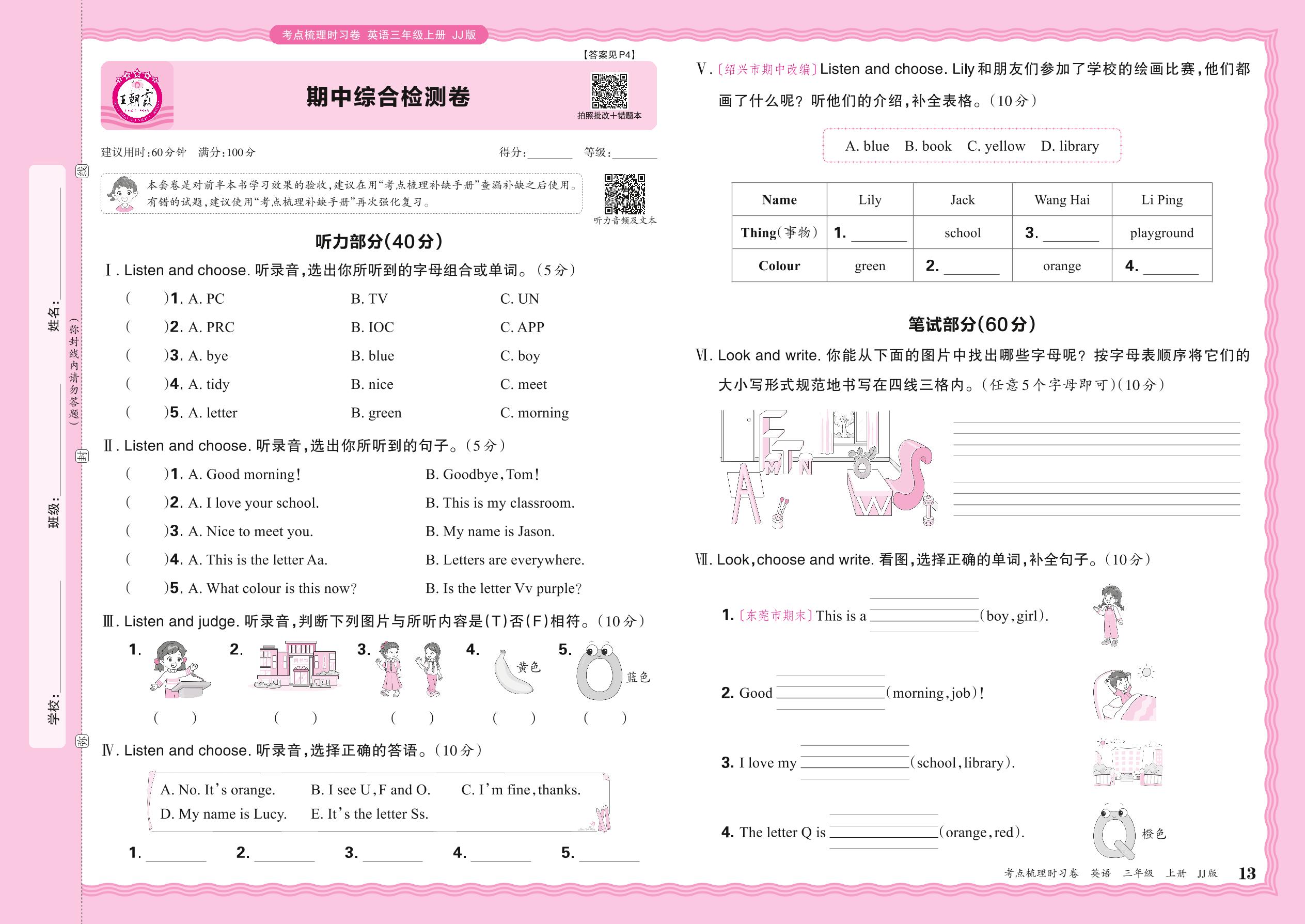 2024秋上册三年级英语冀教版 期中综合检测卷