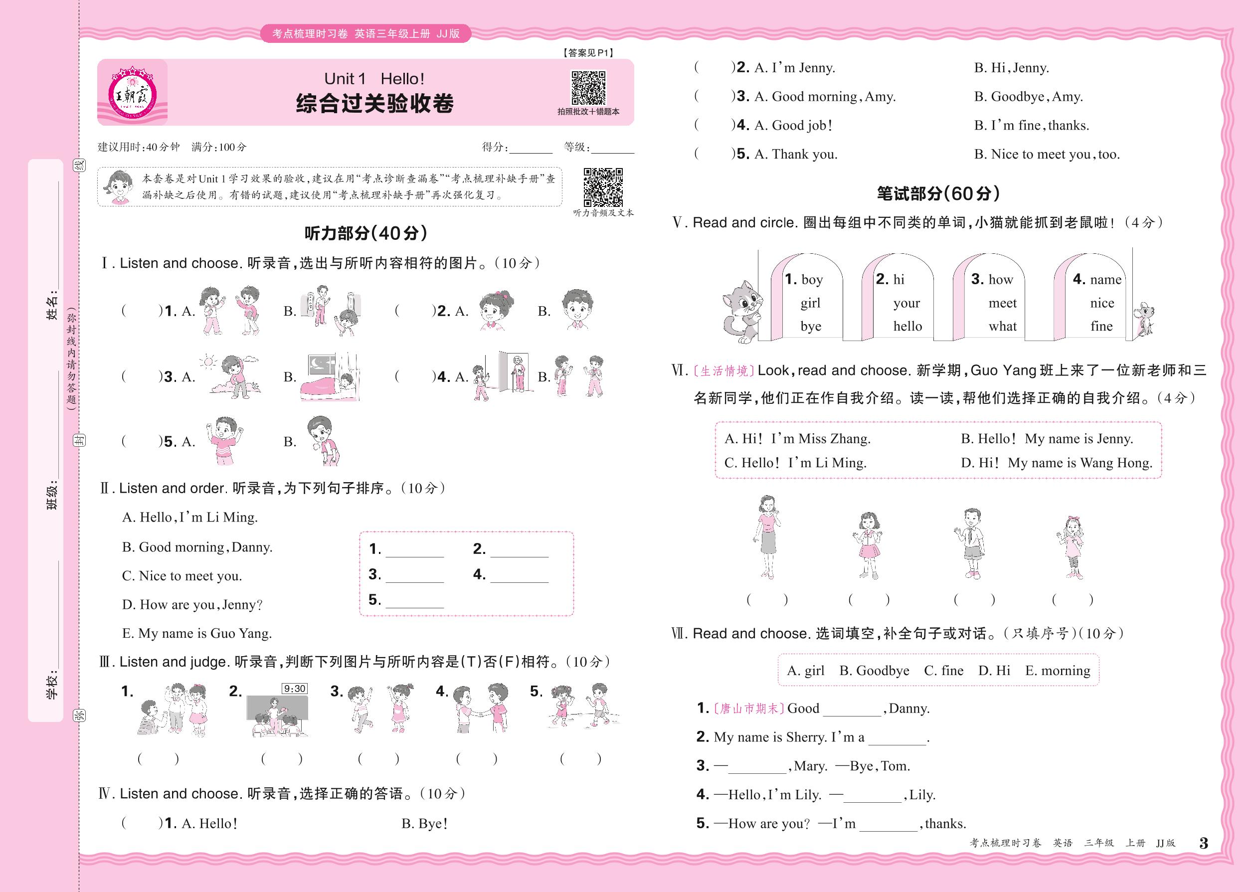 2024秋上册三年级英语冀教版 Unit 1 综合过关验收卷