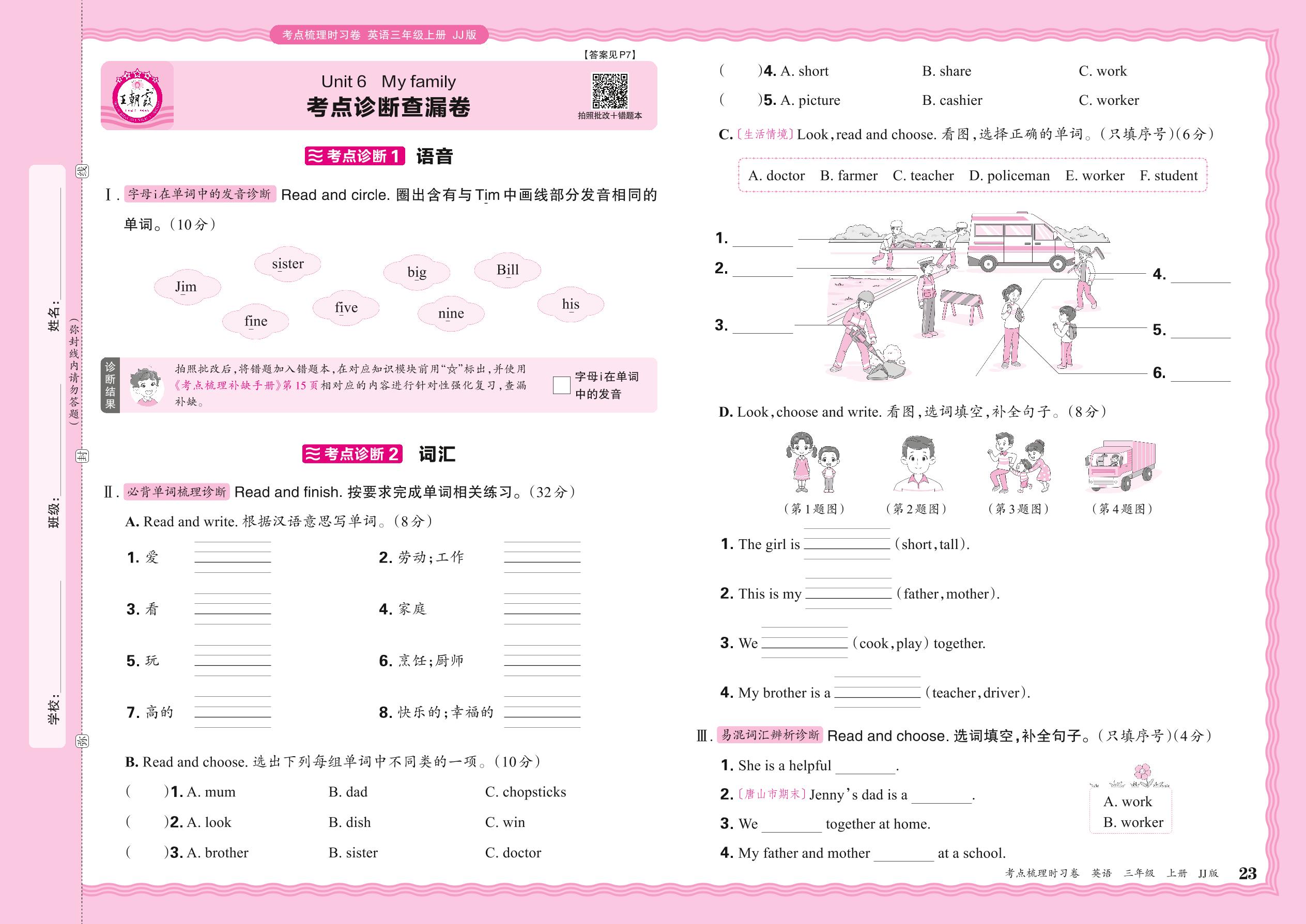 2024秋上册三年级英语冀教版 Unit 6 考点诊断查漏卷