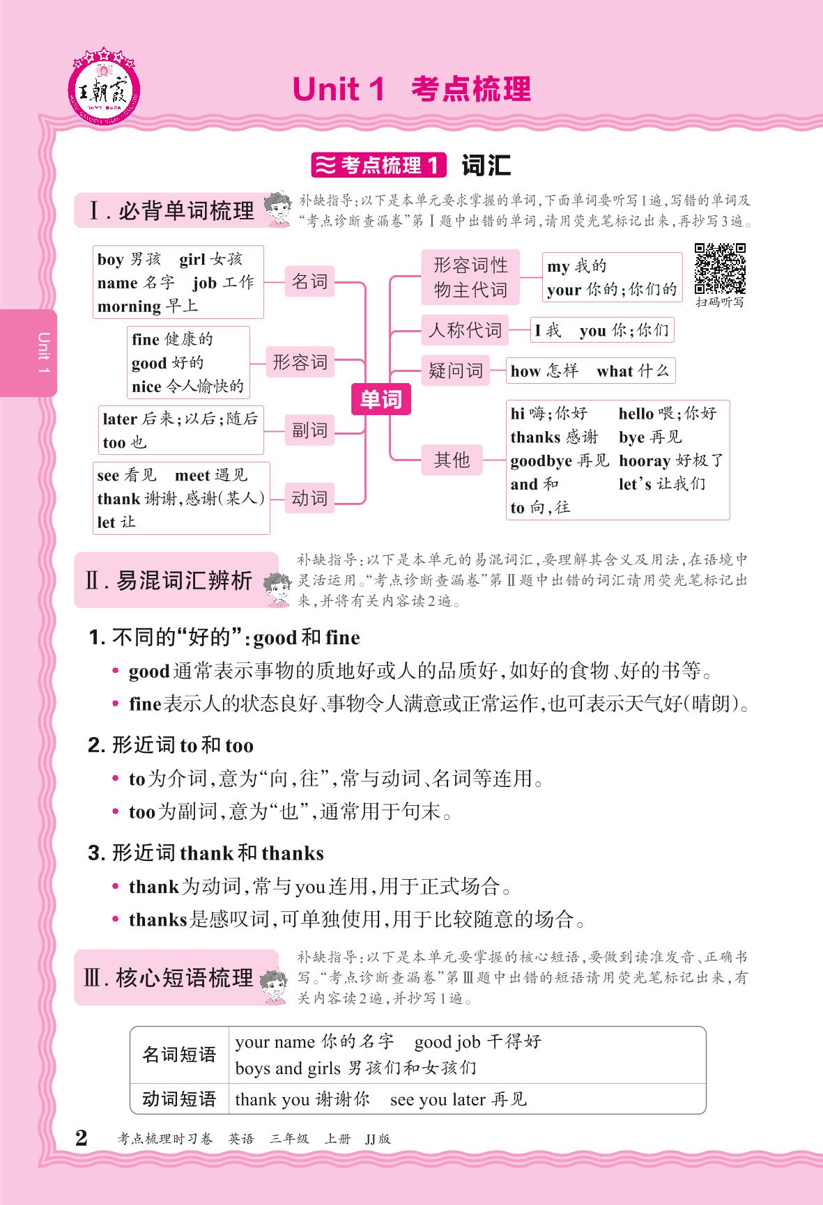 2024秋上册三年级英语冀教版 考点梳理补缺手册——Unit 1 Hello!