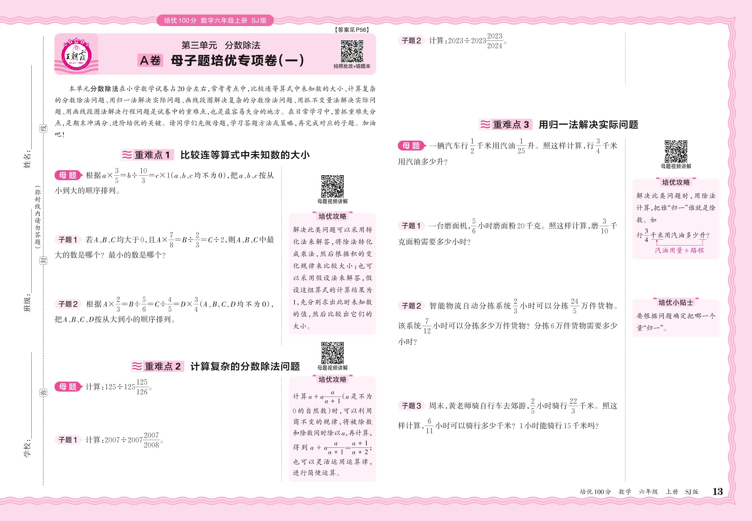 2024秋上册六年级数学苏教版 第三单元A卷 母子题培优专项卷(一)
