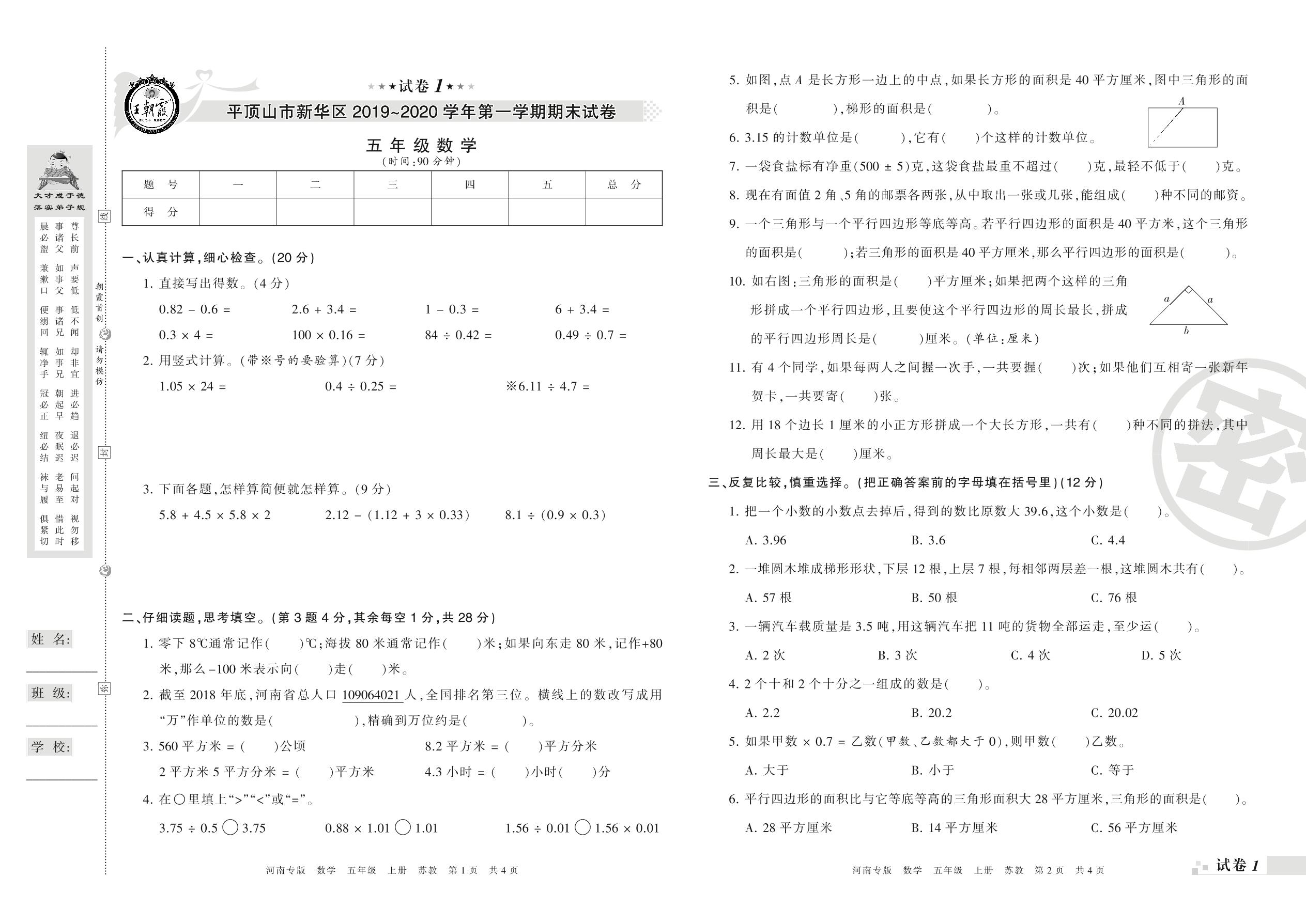 2019-2020学年第一学期平顶山市新华区五年级数学试卷(苏教版)【1】
