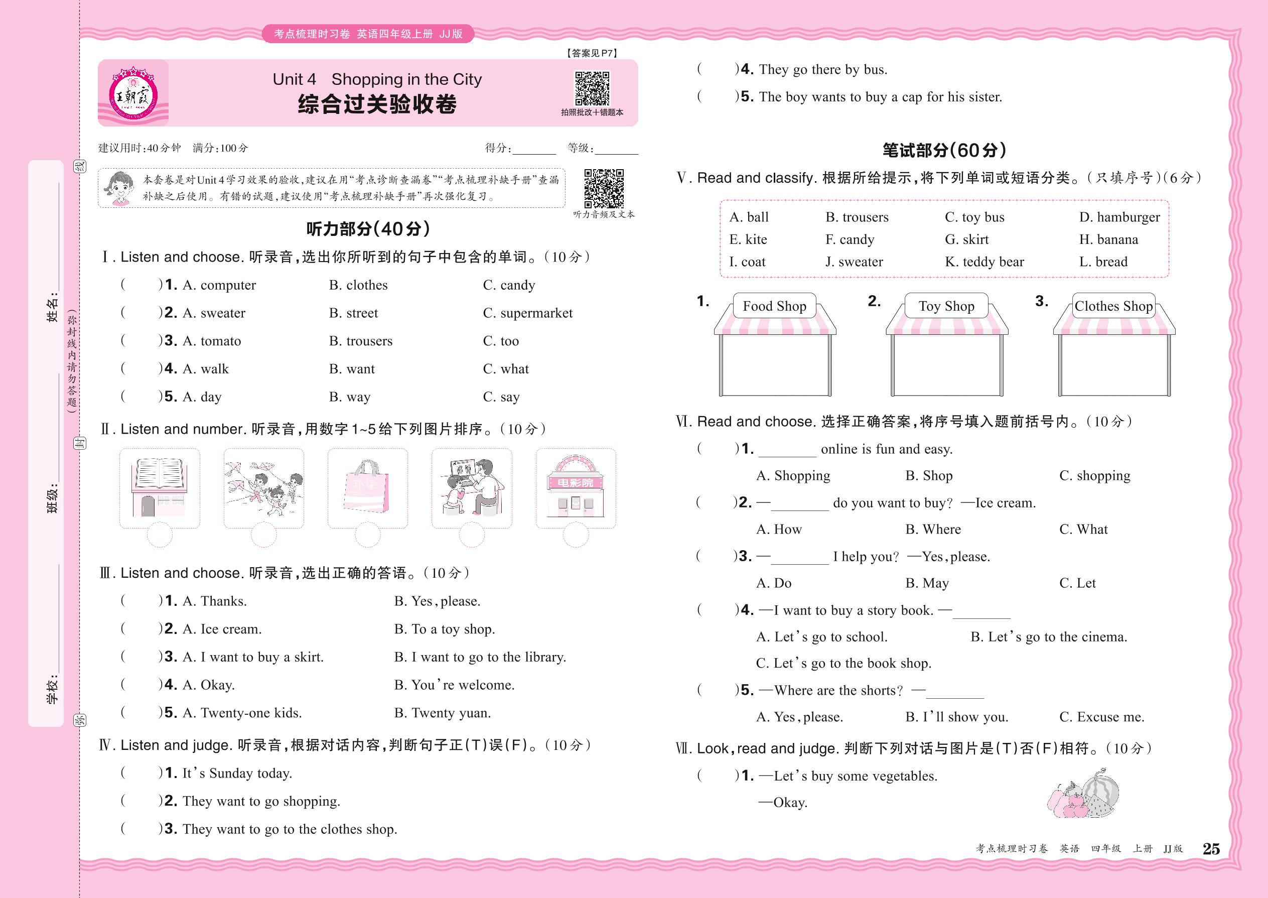 2024秋上册四年级英语冀教版 Unit 4 综合过关验收卷