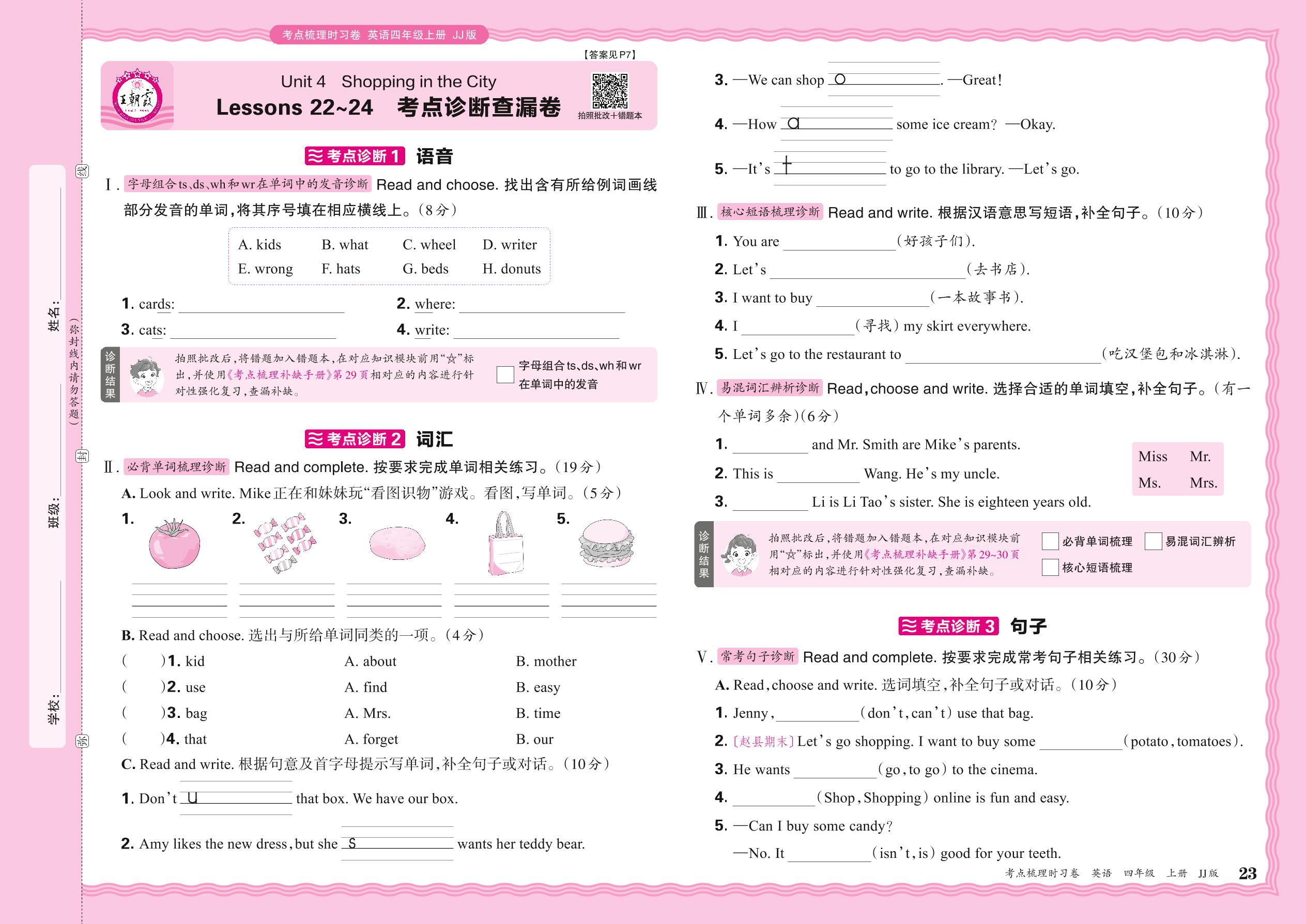 2024秋上册四年级英语冀教版 Unit 4 Lessons 22~24 考点诊断查漏卷