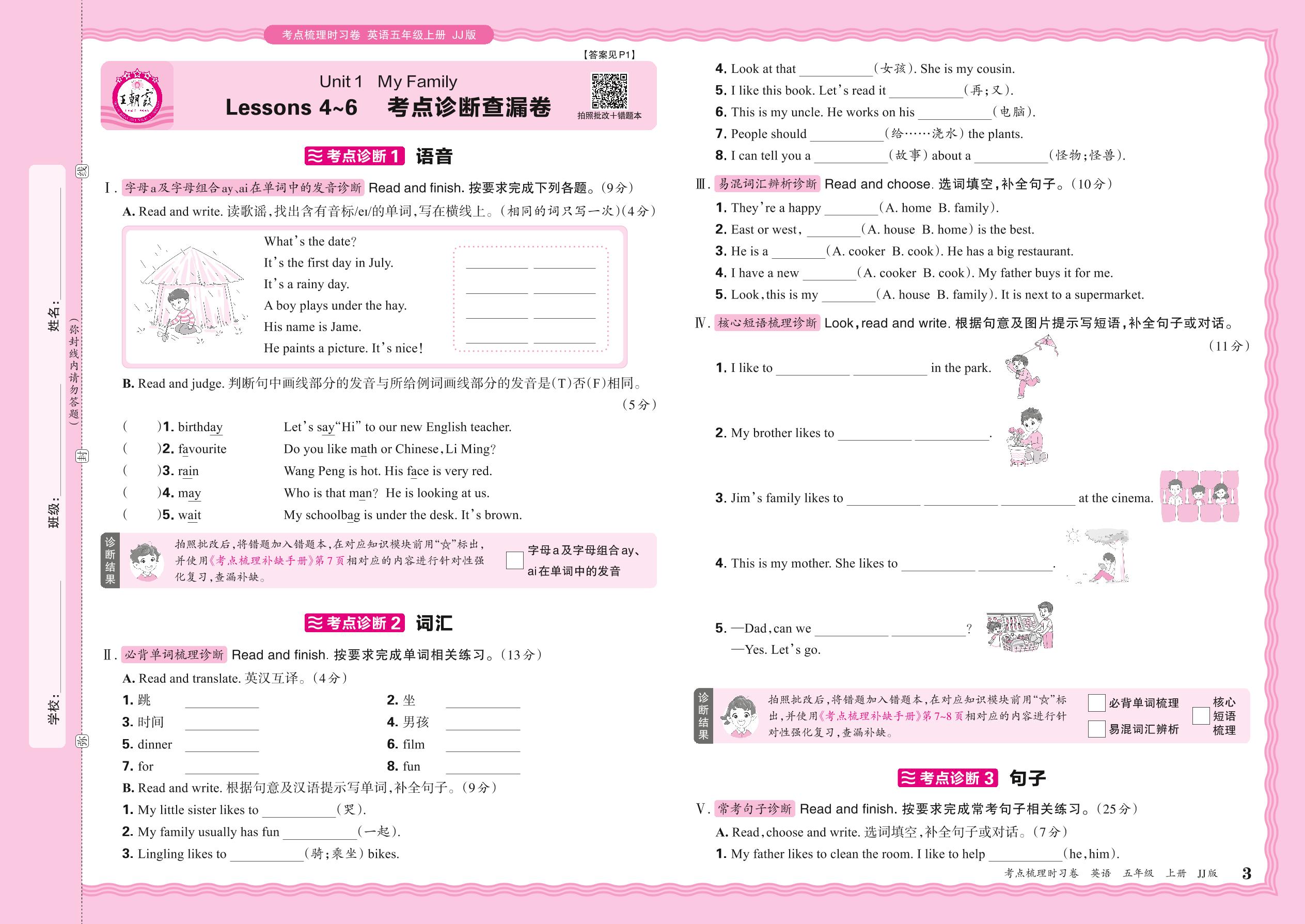 2024秋上册五年级英语冀教版 Unit 1 Lessons 4~6 考点诊断查漏卷