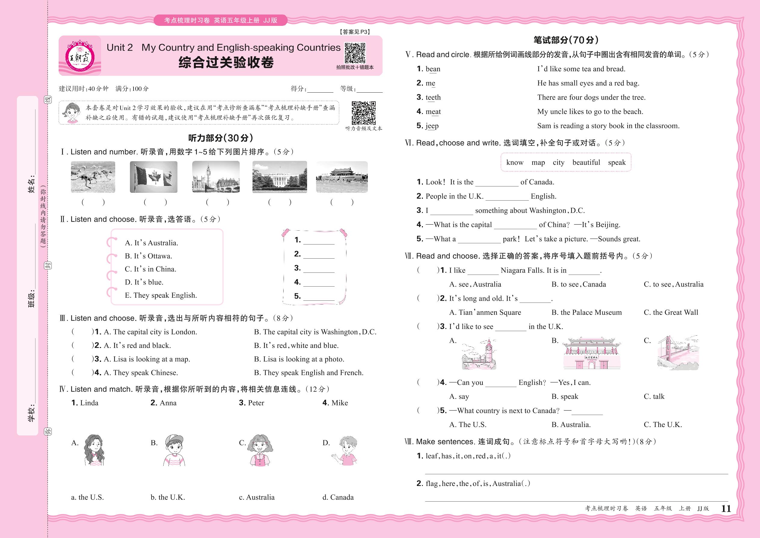 2024秋上册五年级英语冀教版 Unit 2 综合过关验收卷