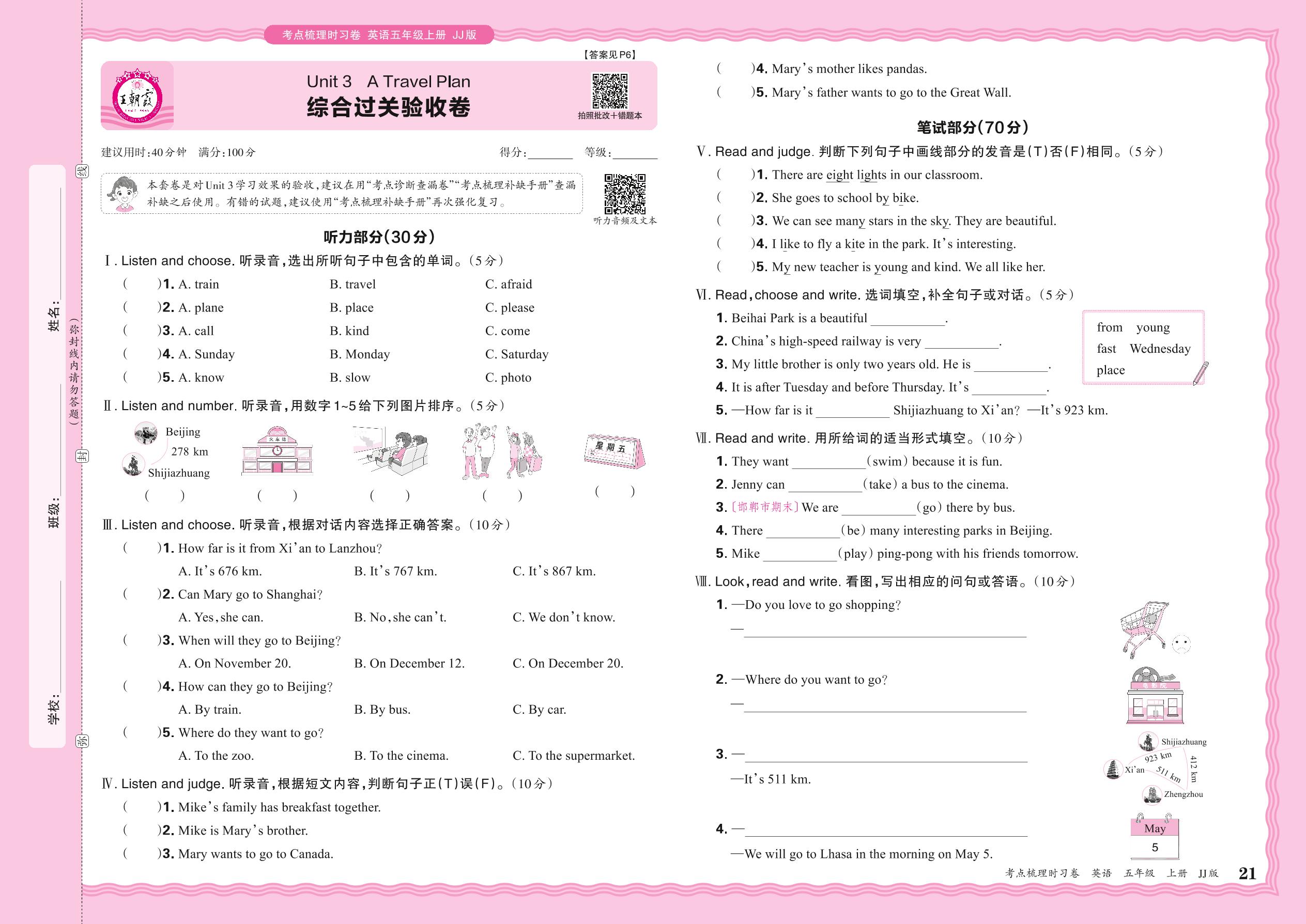 2024秋上册五年级英语冀教版 Unit 3 综合过关验收卷