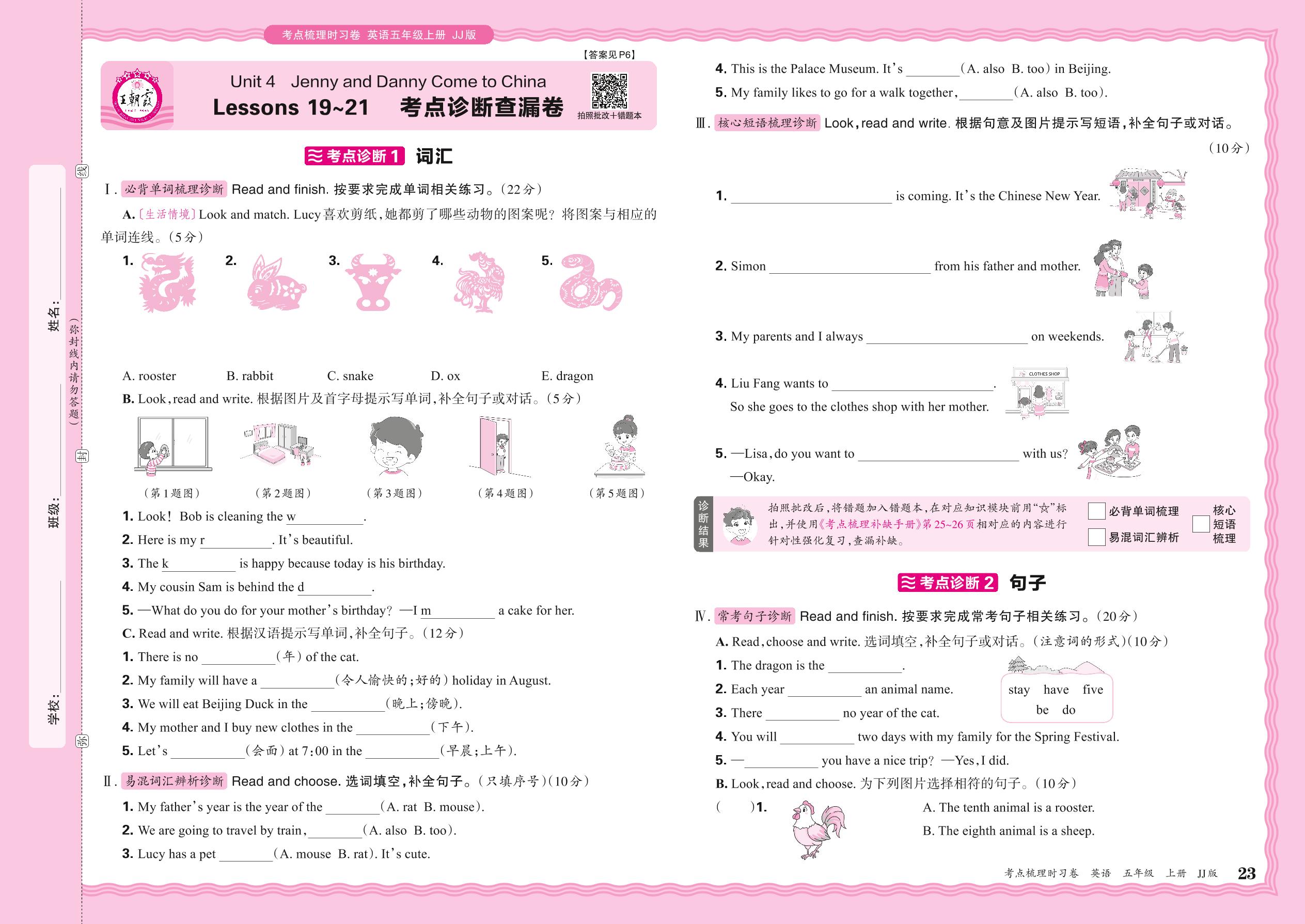 2024秋上册五年级英语冀教版 Unit 4 Lessons 19~21 考点诊断查漏卷
