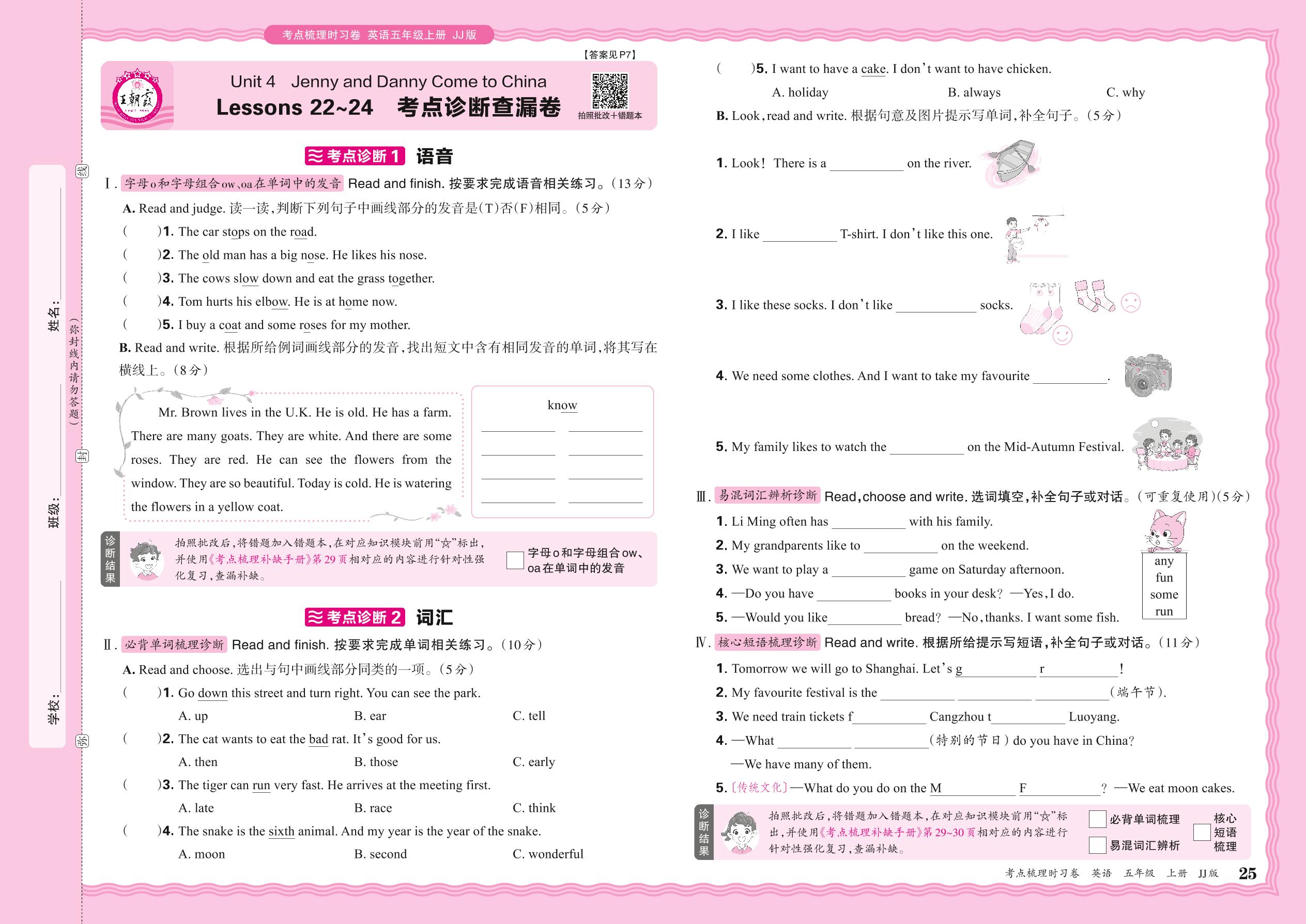 2024秋上册五年级英语冀教版 Unit 4 Lessons 22~24 考点诊断查漏卷