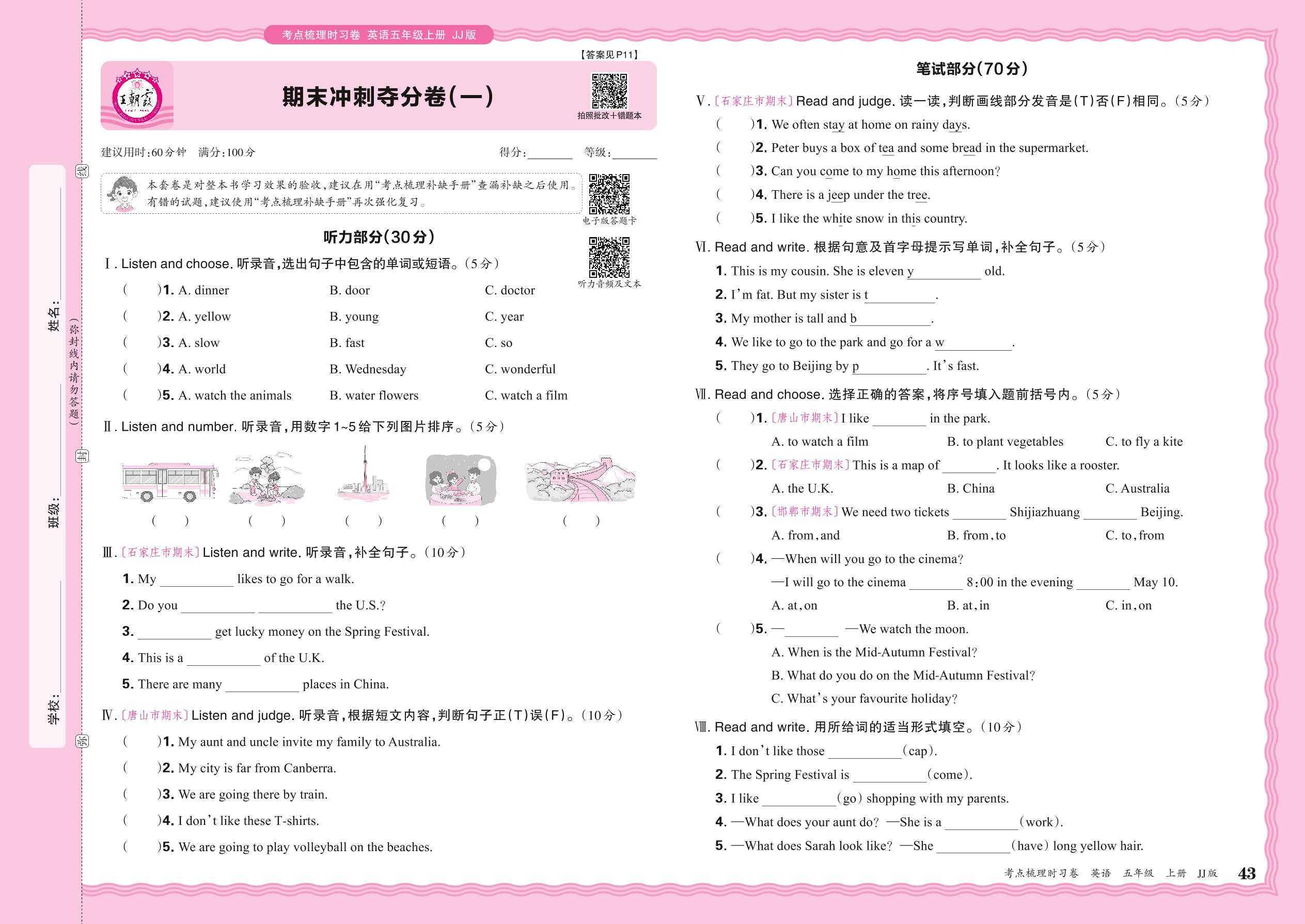 2024秋上册五年级英语冀教版 期末冲刺夺分卷(一)