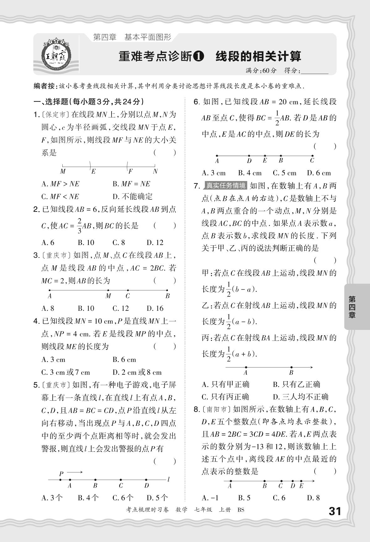 2024秋上册七年级数学北师版 第四章 重难考点诊断 线段的相关计算【1】