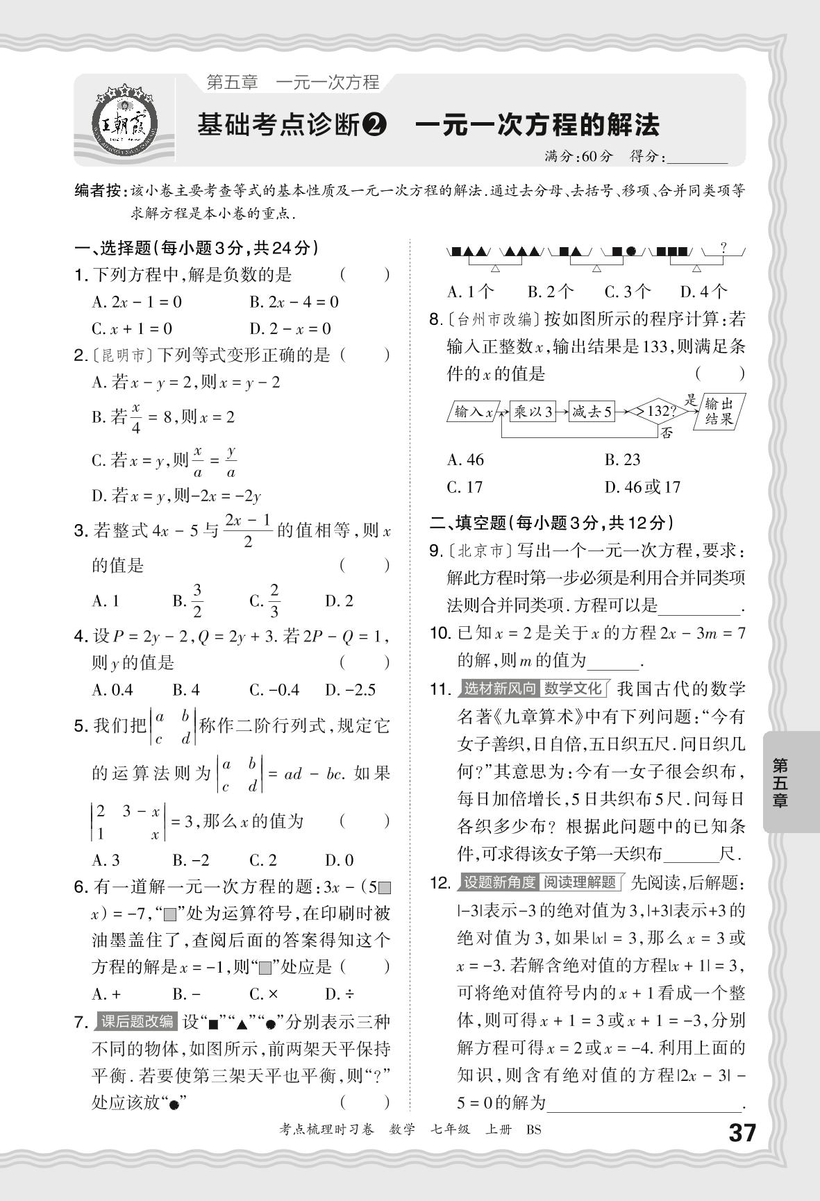 2024秋上册七年级数学北师版 第五章 基础考点诊断 一元一次方程的解法【2】
