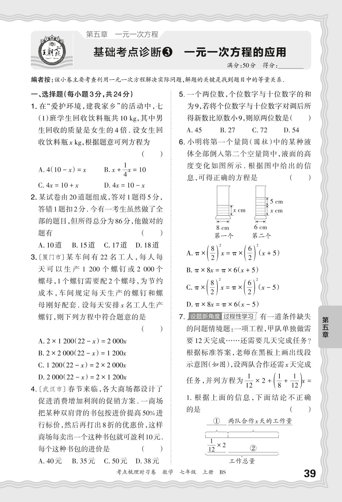 2024秋上册七年级数学北师版 第五章 基础考点诊断 一元一次方程的应用【3】