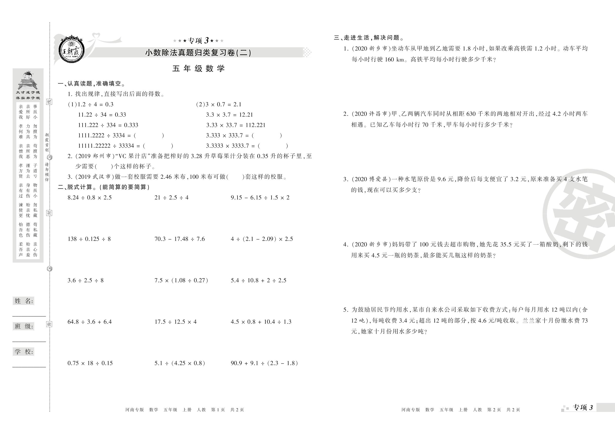 王朝霞期末专项卷——小数除法、简易方程真题归类复习五年级上册数学(人教版)【0】