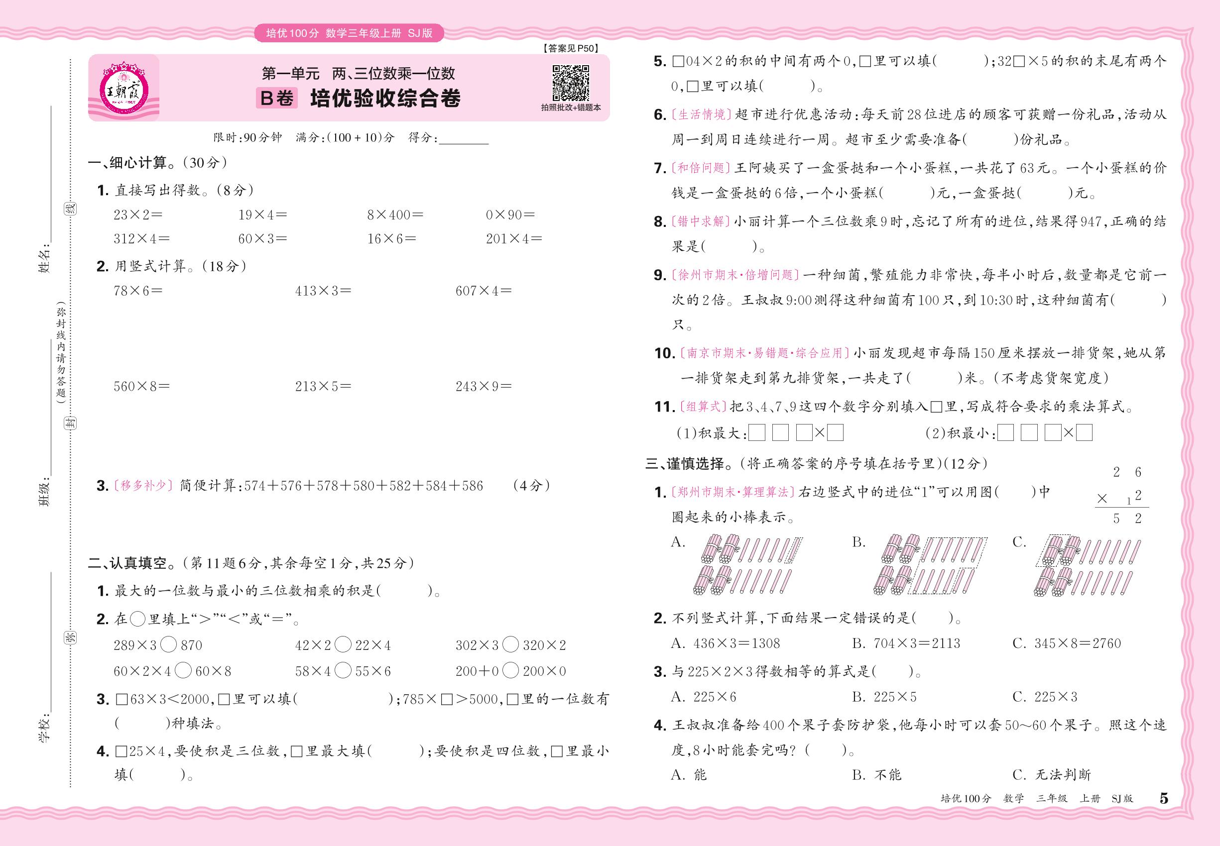 2024秋上册三年级数学苏教版 第一单元B卷 培优验收综合卷_R240827103602433