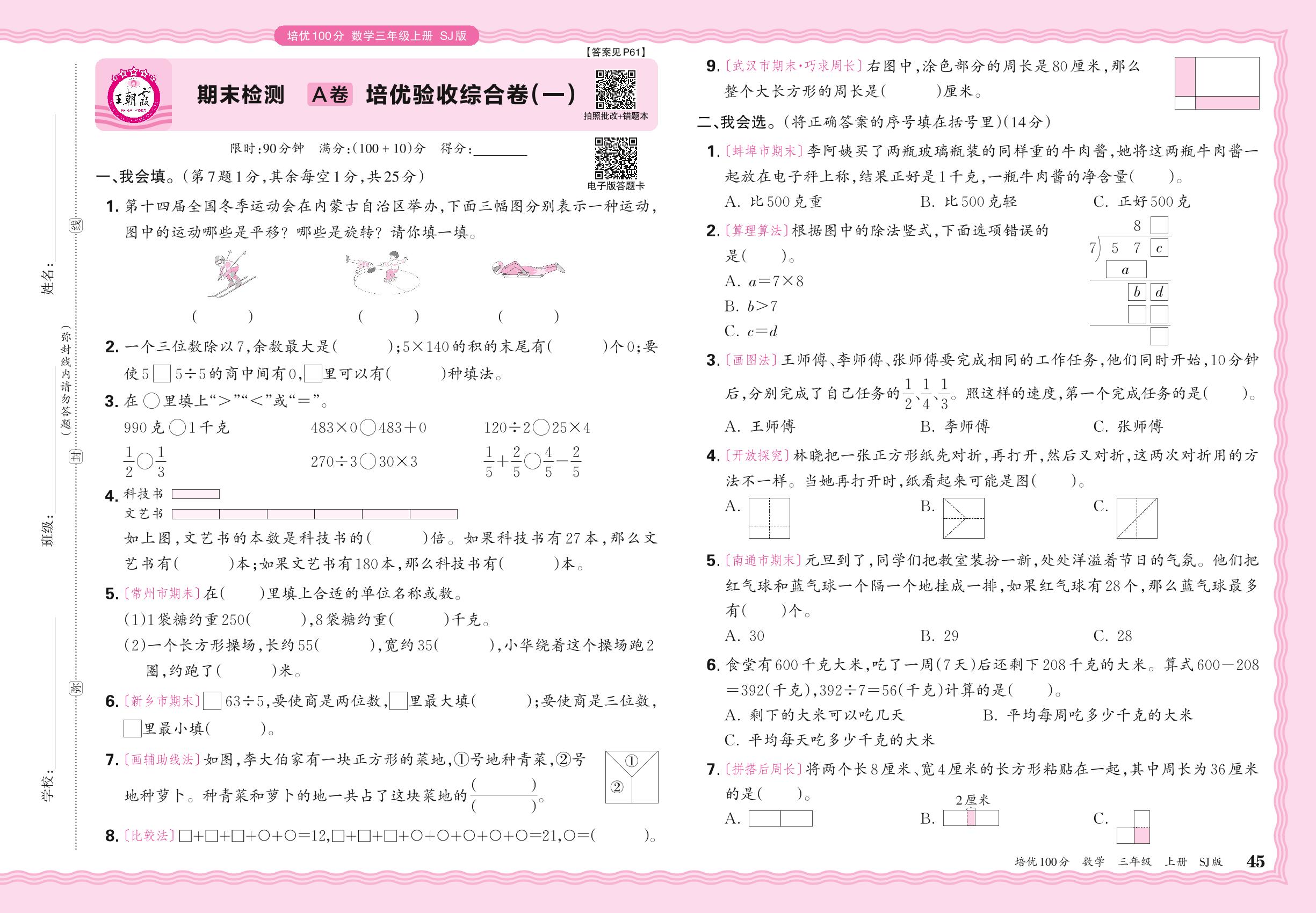 2024秋上册三年级数学苏教版 期末检测A卷 培优验收综合卷(一)