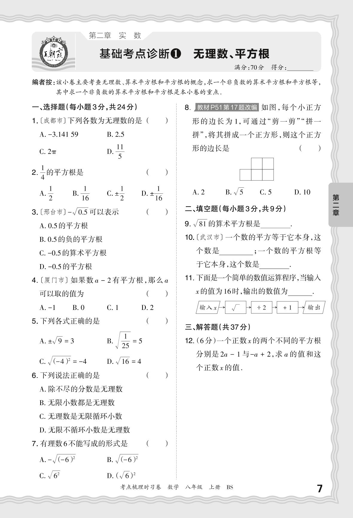 2024秋上册八年级数学北师版 第二章 基础考点诊断 无理数 、平方根【1】