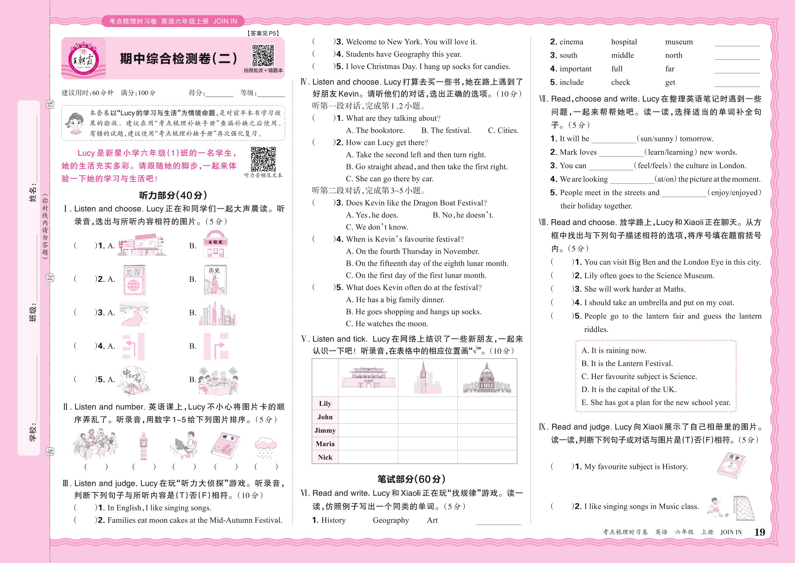 2024秋上册六年级英语剑桥版 期中综合检测卷(二)