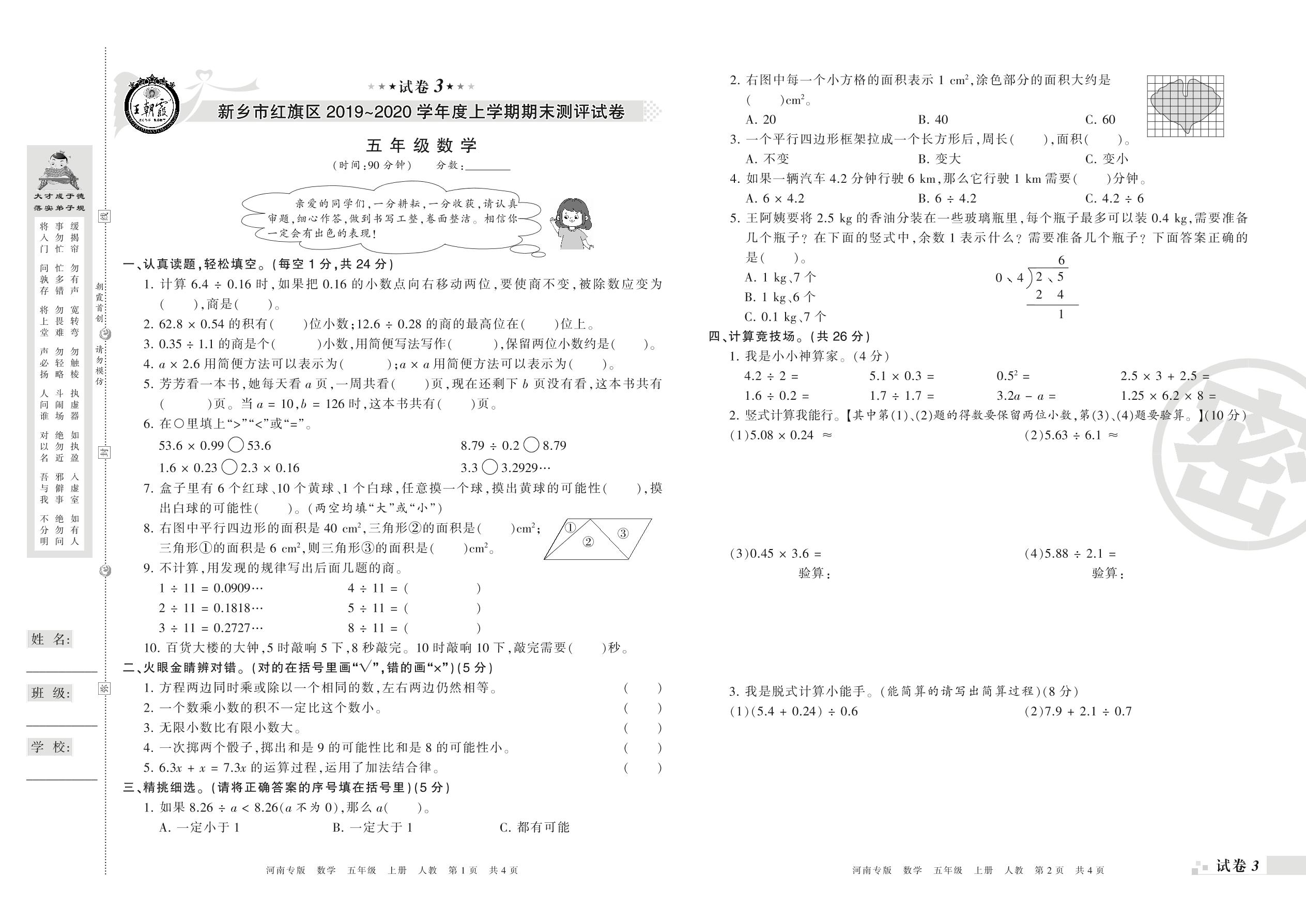2019-2020学年第一学期新乡市红旗区五年级数学试卷(人教版)【3】