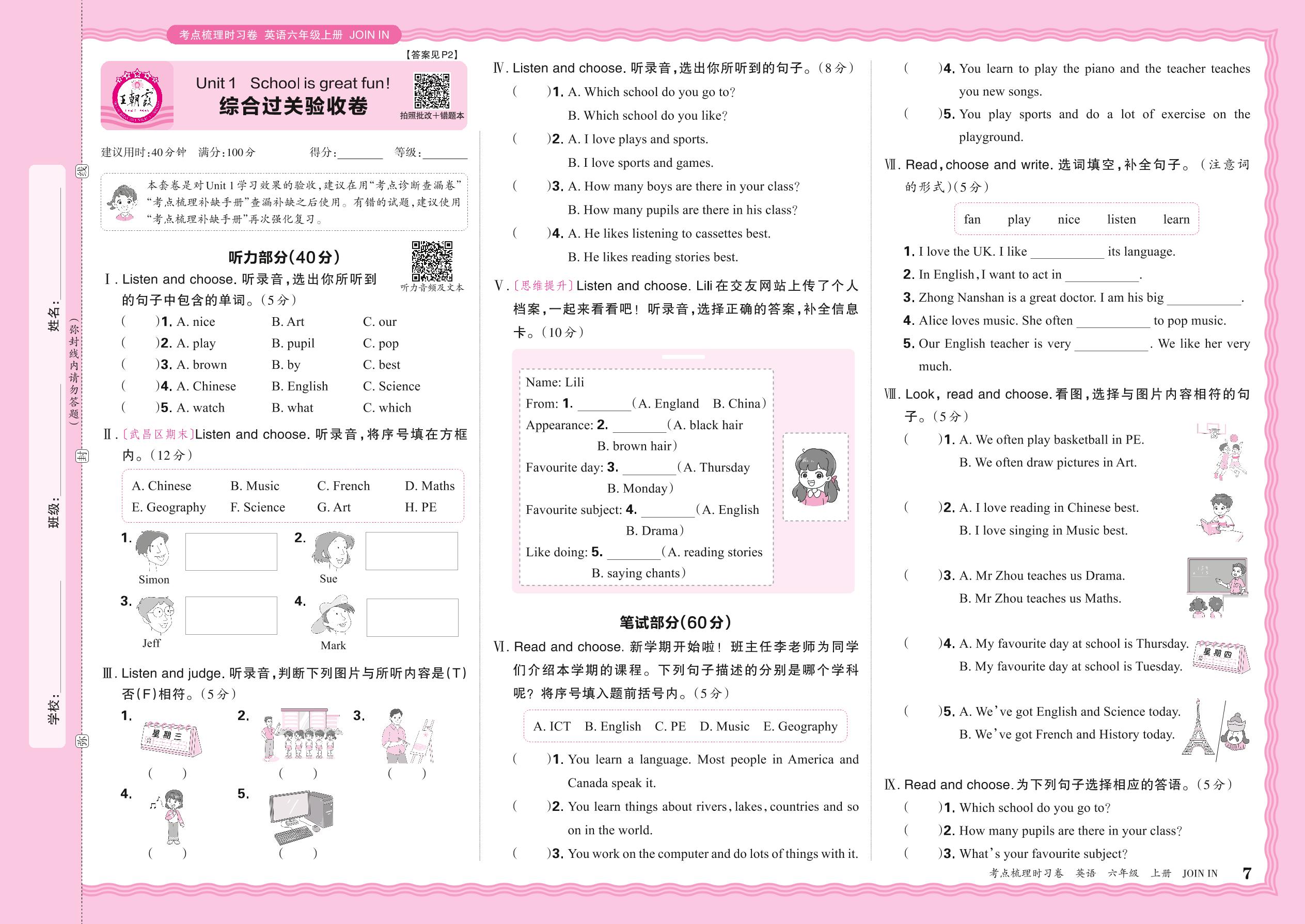 2024秋上册六年级英语剑桥版 Unit 1 综合过关验收卷